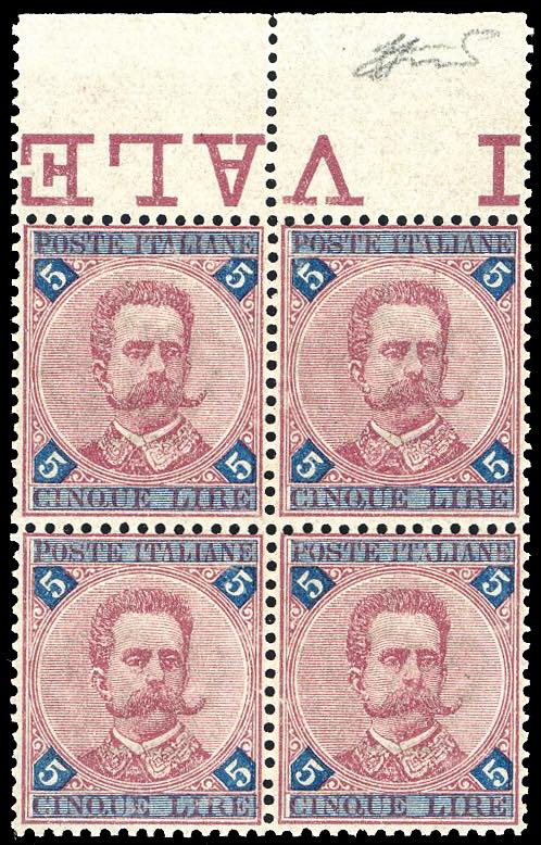 1891 - 5 lire carminio e azzurro Umberto I (64), ben centrato, blocco di quattro, bordo di foglio in alto, nuovo, gomma originale integra, perfetto. Ferrario.