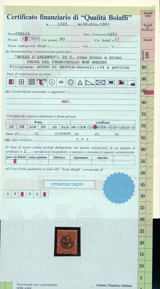 1893 - 20 cent. rosso bruno e bruno Nozze d'argento, non emesso (64A), ben centrato, nuovo, gomma originale integra, perfetto. Splendido e raro in queste condizioni qualitative. Cert. Finanziario Bolaffi 85%.