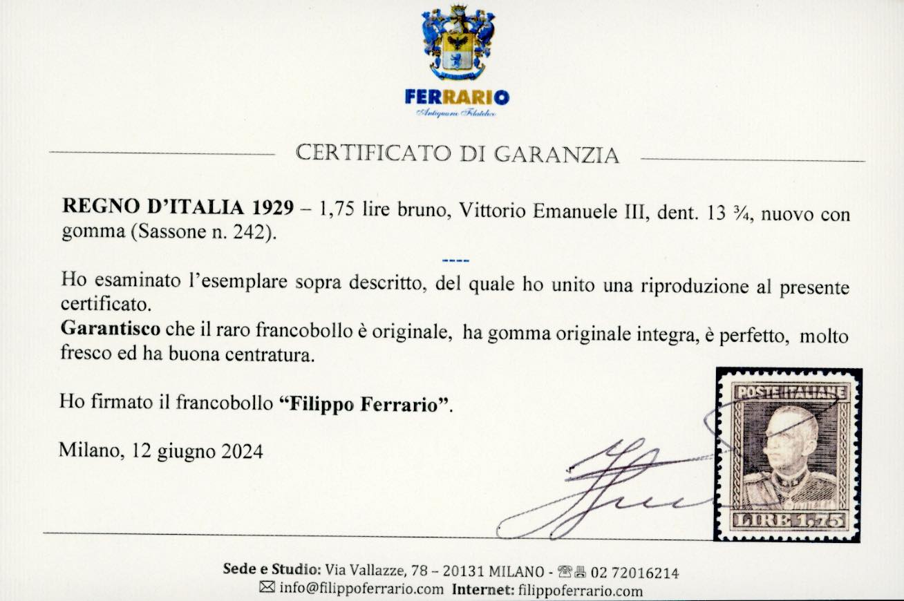 1929 - 1,75 lire bruno Vittorio Emanuele III, dent. 13 3/4 (242), nuovo, buona centratura, gomma originale integra, perfetto e molto ... Leggi tutto