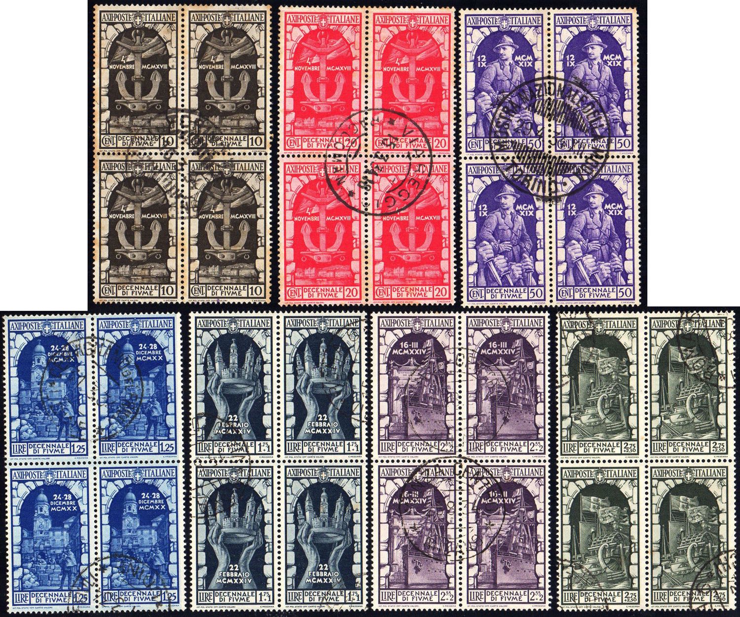1934 - Annessione di Fiume, posta ordinaria (350/356), blocchi di quattro, usati, lievi ossidazioni.