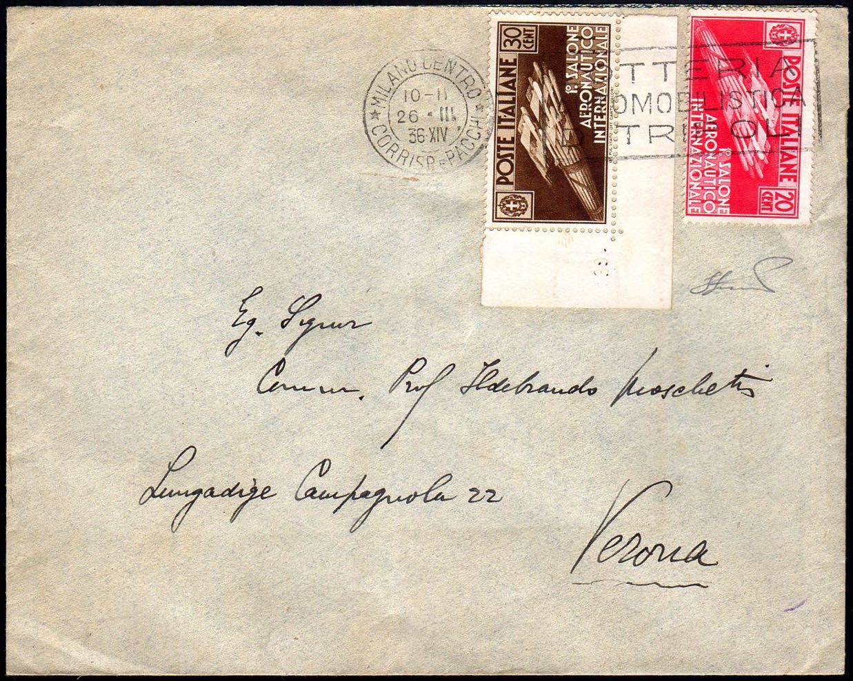 1936 - 30 cent., angolo di foglio con numero di cilindro "39.", 20 cent. Salone Aeronautico (385/384), perfetti, su busta da Milano 26/3/1936 a Verona. Rarissima, probabilmente unica. Ferrario.