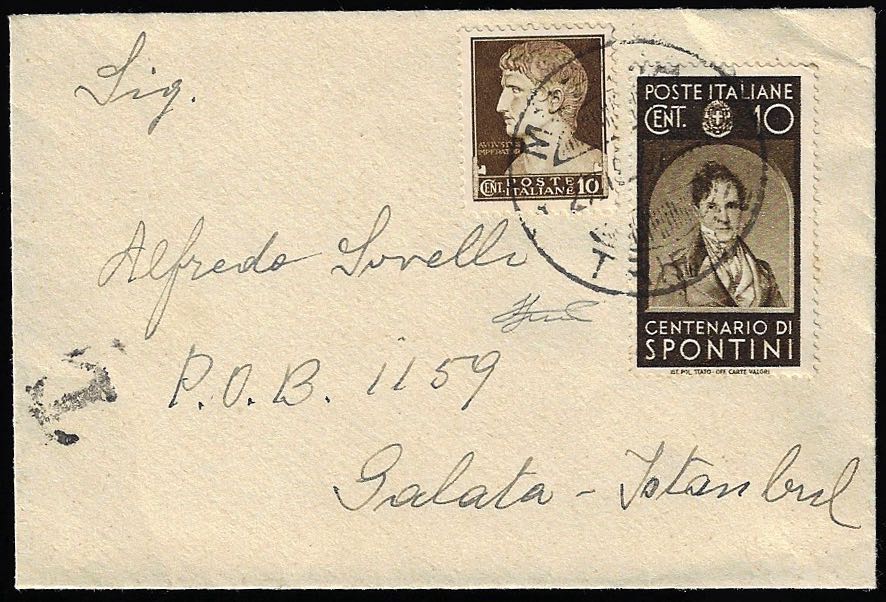 1937 - 10 cent. Illustri, 10 cent. Imperiale (426,245), perfetti, su piccola busta da Trieste 27/12/1937 ad Instanbul. Bella combinazione ... Leggi tutto