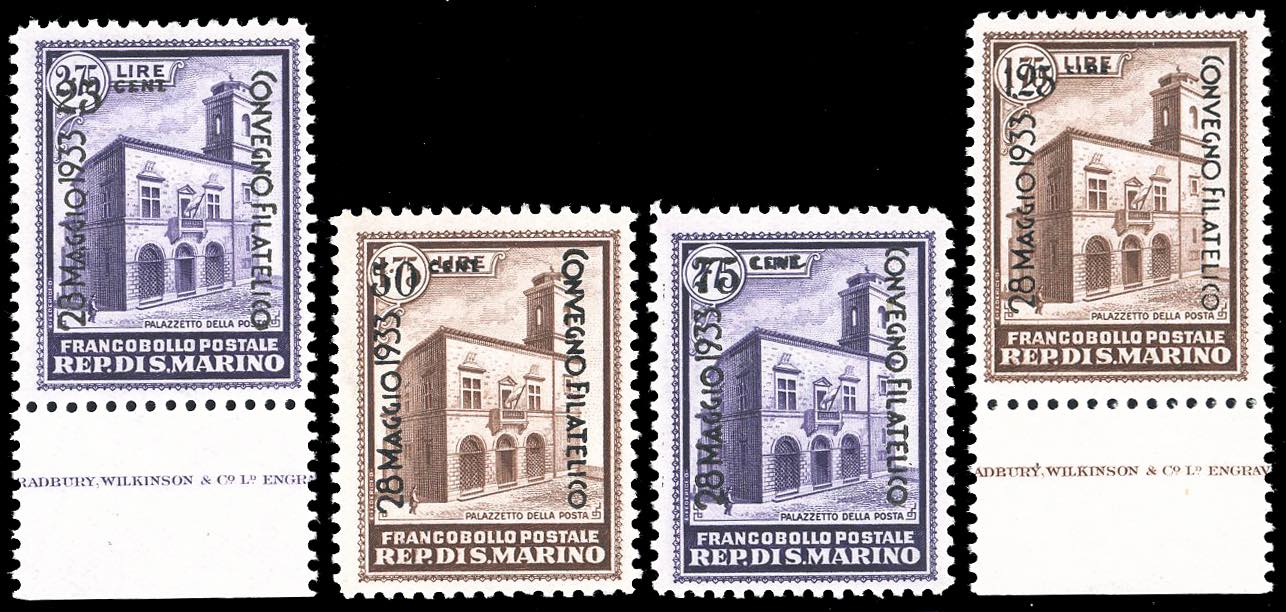 1933 - Soprastampati "Convegno Filatelico", serie completa (176/179), nuovi, gomma originale integra, perfetti e di ottima qualità. Cert. Ferrario.