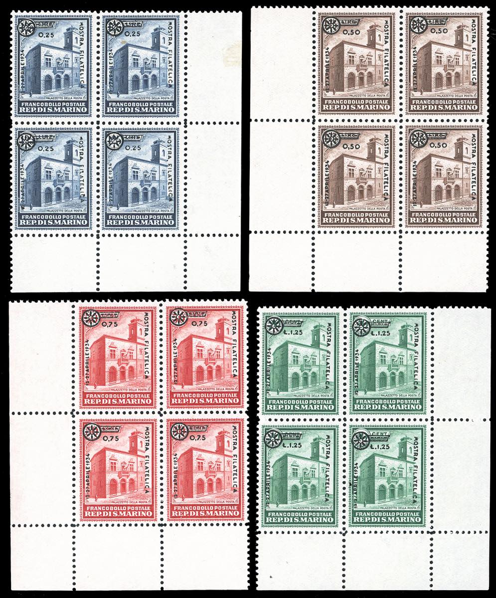 1934 - Soprastampati "Mostra Filatelica", serie completa (180/183), blocchi di quattro, angolo di foglio, nuovi, gomma originale integra, perfetti. Molto belli. Ferrario.