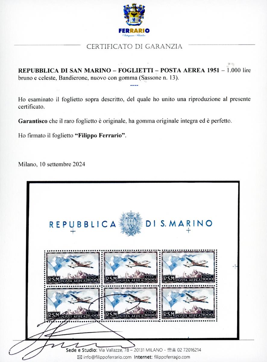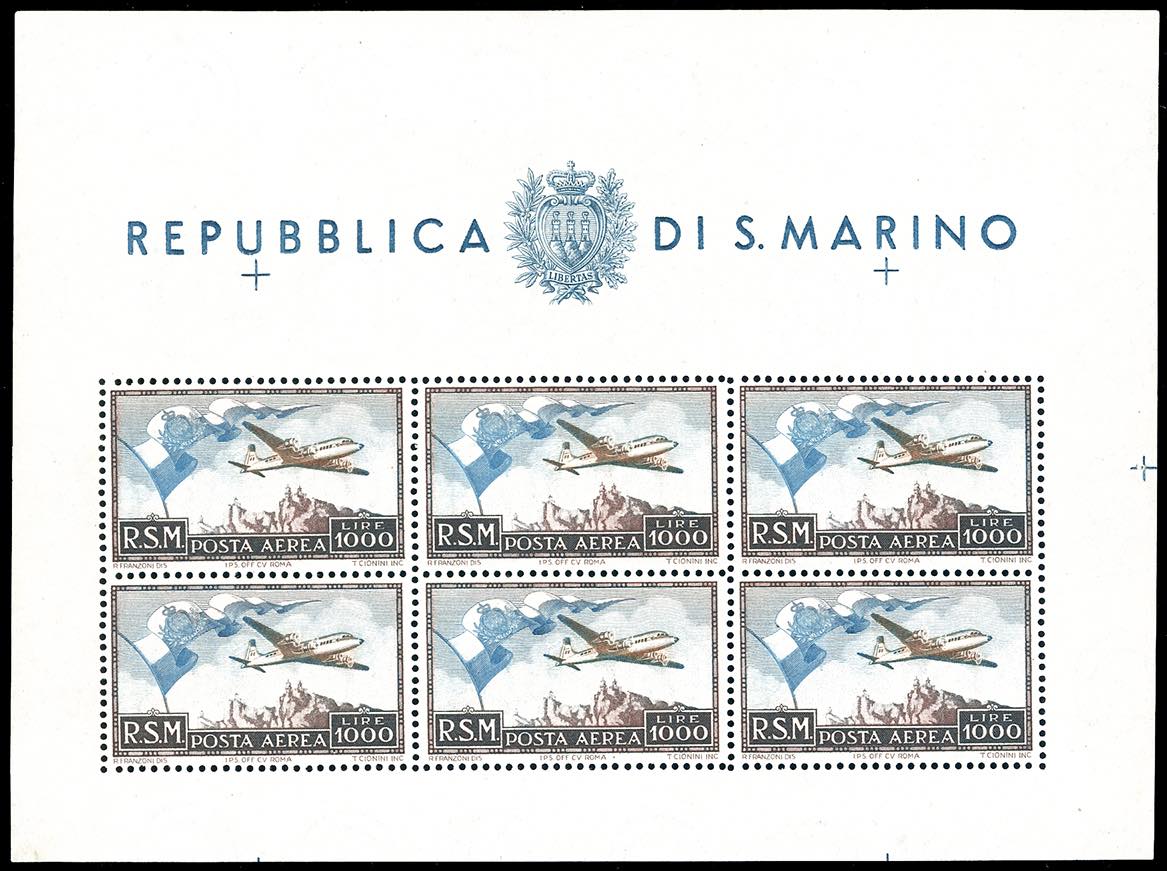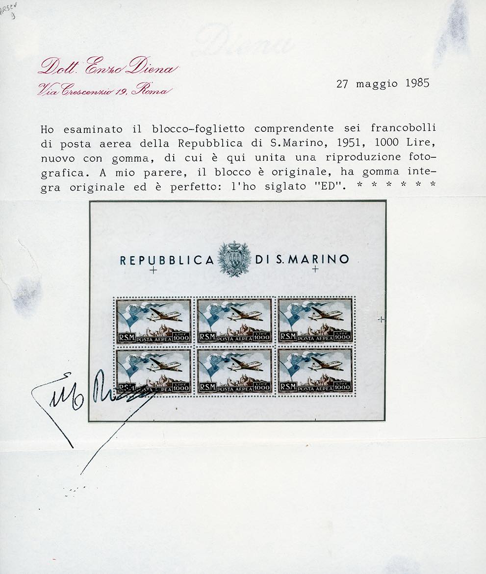 1951 - 1.000 lire Bandierone, foglietto (13), gomma originale integra, perfetto. Cert. E.Diena.