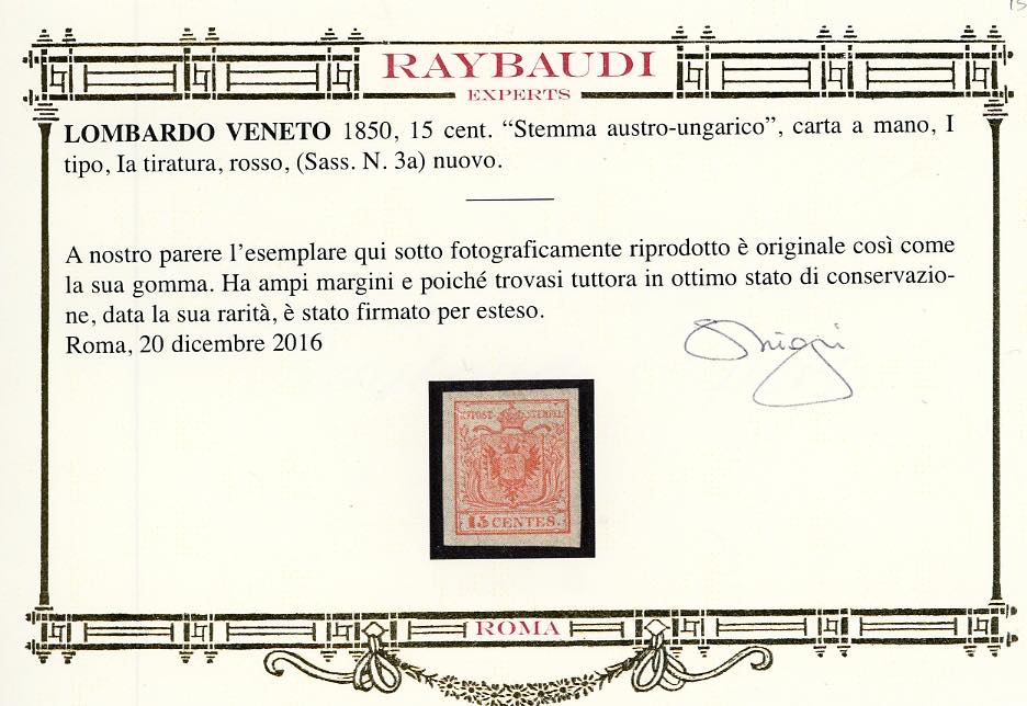 1850 - 15 cent. rosso, I tipo, carta a mano, varietà "5" di "15" simile ad un "3" (3a/3o), gomma originale, perfetto. UNICO ESEMPLARE ... Leggi tutto