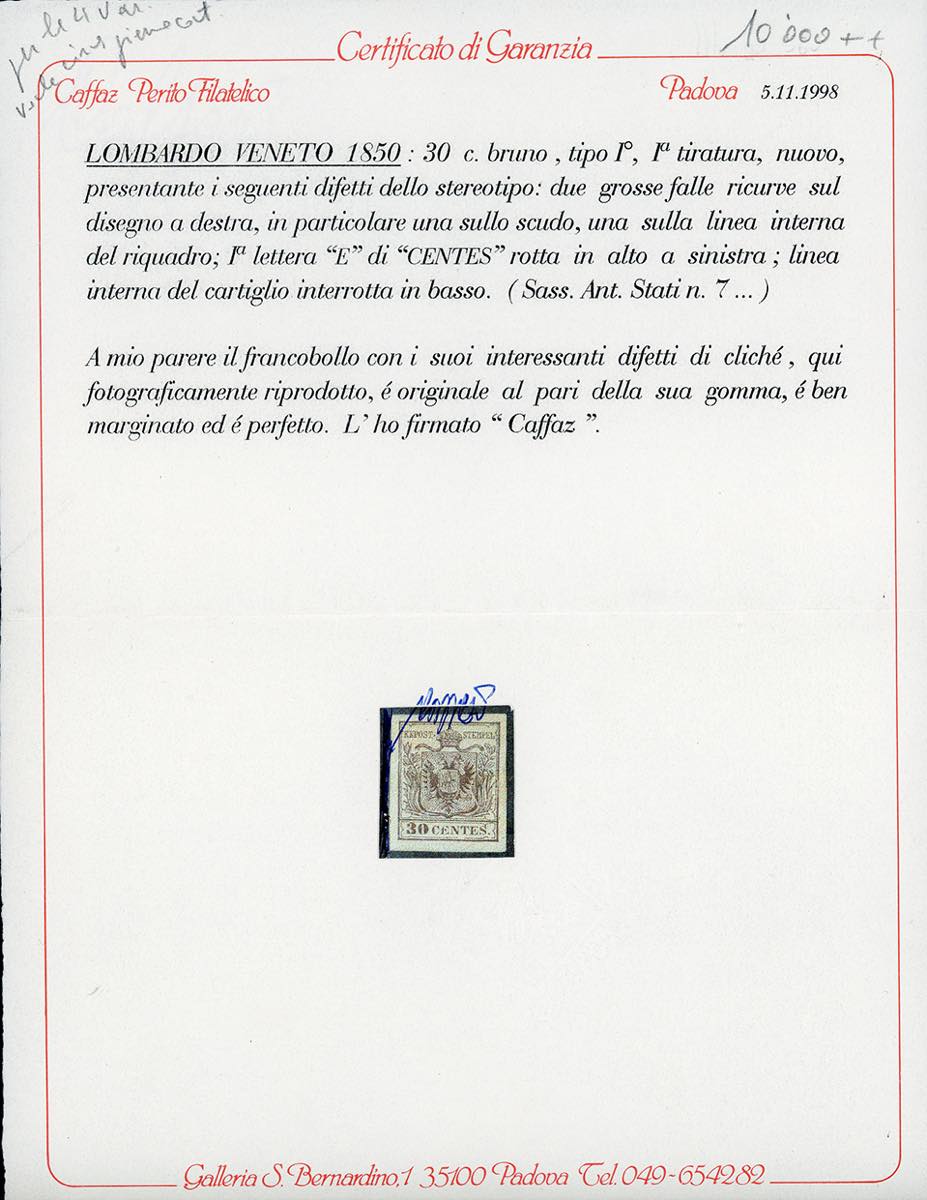 1850 - 30 cent. bruno, I tiratura (7b), gomma originale, perfetto e ben marginato. Em.Diena, cert. A.Diena e Caffaz.