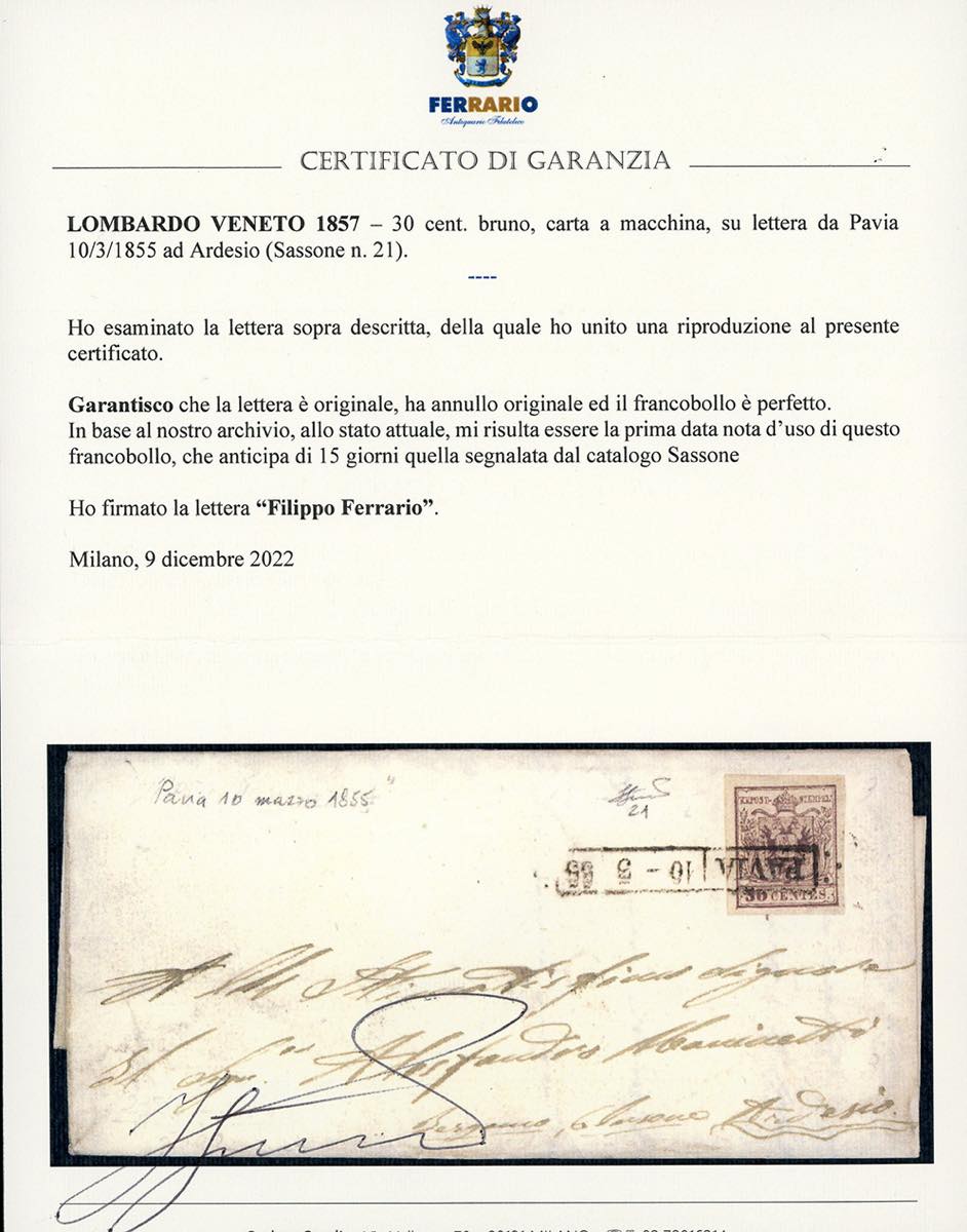 1855 - 30 cent. bruno, carta a macchina (21), perfetto e ben marginato, su lettera da Pavia 10/3/1855 ad Ardesio. PRIMA DATA NOTA D'USO DI QUESTO FRANCOBOLLO, che anticipa di 15 giorni quella segnalata dal Sassone. Finora inedita e di grande interesse. Cert. Ferrario.