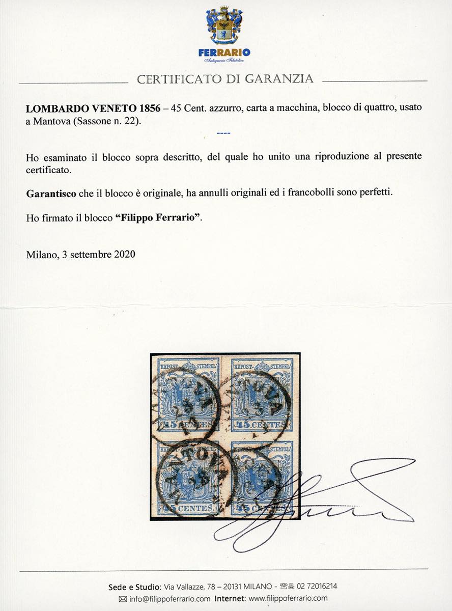 1856 - 45 cent. azzurro, carta a macchina (22), blocco di quattro, usato a Mantova, perfetto. Splendido e raro! A.Diena per esteso, cert. ... Leggi tutto