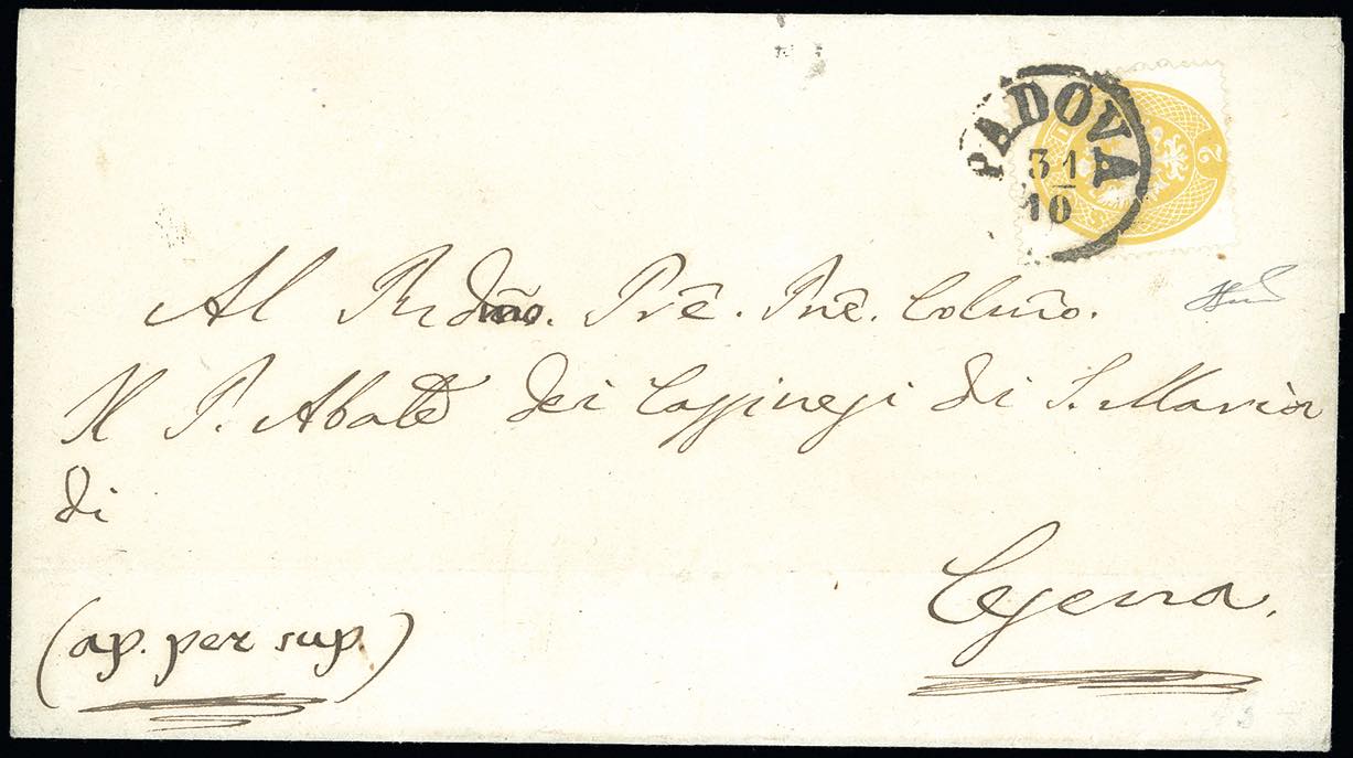 1864 - 2 soldi giallo, dent. 14 (36), perfetto, isolato su lettera da Padova 31/10/1866 a Cesena, bollo d'arrivo. Non comune uso per ... Leggi tutto