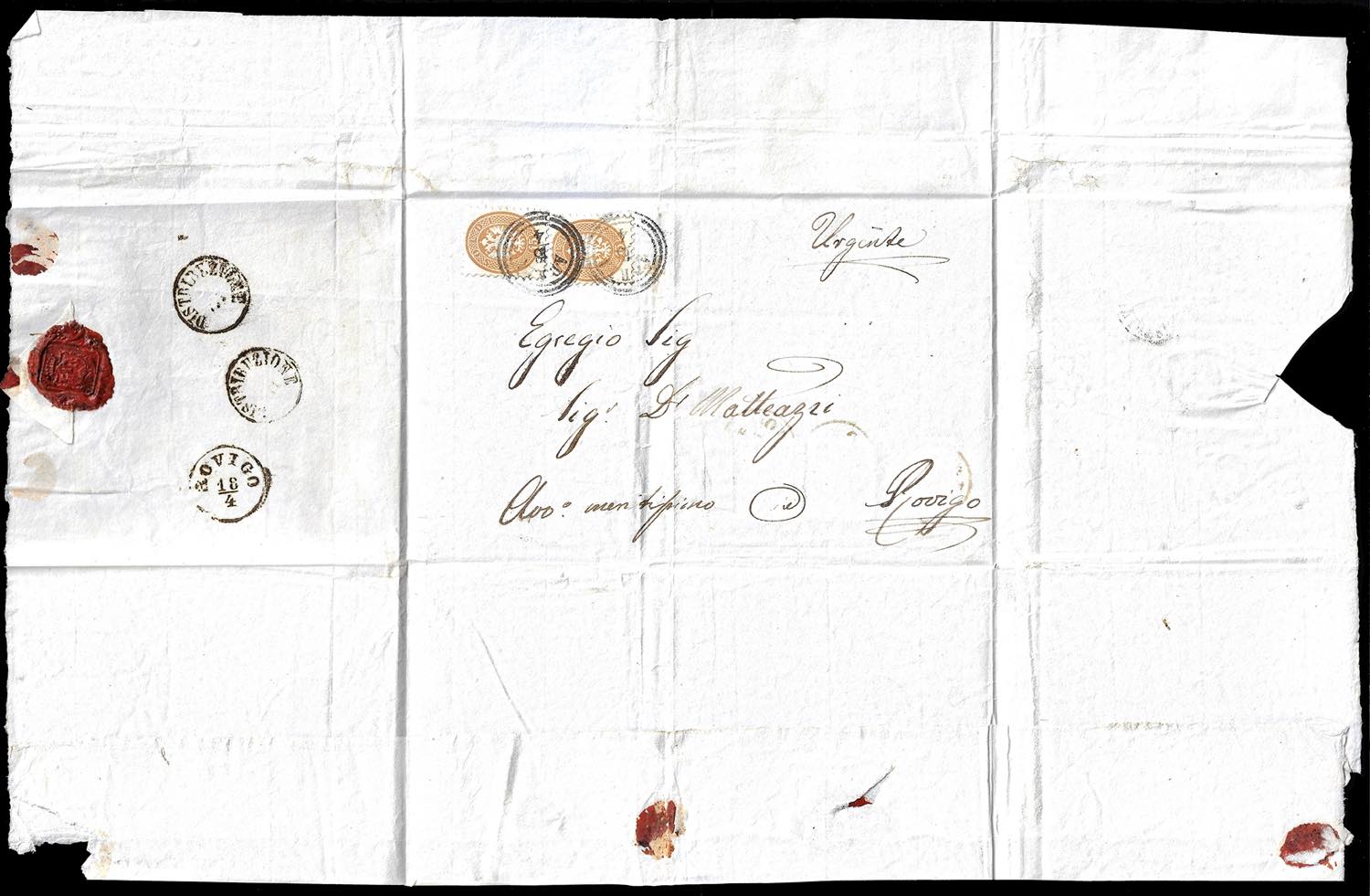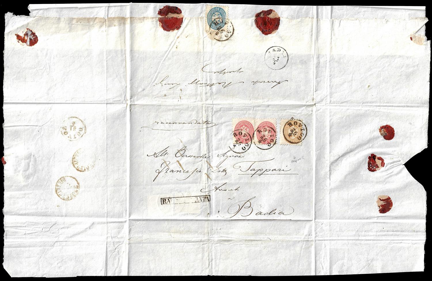 1864 - 15 soldi bruno, dent. 9 1/2 (45), due esemplari, perfetti, su fresca lettera di porto multiplo da Adria 18/4 a Rovigo. Successivamente l'involucro venne rivoltato per essere riutilizzato per una rispedizione, previa nuova affrancatura con 5 soldi rosa, due esemplari, 15 soldi bruno e, al verso per il diritto di raccomandazione, 10 soldi azzurro, tutti dent. 9 1/2 (43,45,44), perfetti ad eccezione del 10 soldi, danneggiato all'apertura della lettera, da Rovigo 26/4 a Badia, bollo in cartella "raccomandata" sul fronte. Eccezionale e rarissimo riutilizzo della stessa lettera per due diverse spedizioni affrancate, una delle quali raccomandata.