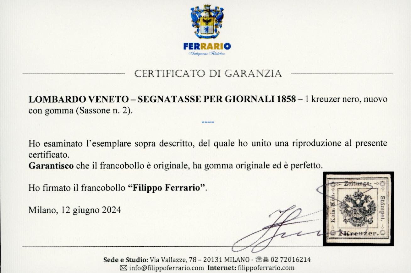 1859 - 1 kr. nero (2), gomma originale, perfetto. Raro. Cert. A.Diena e Ferrario.