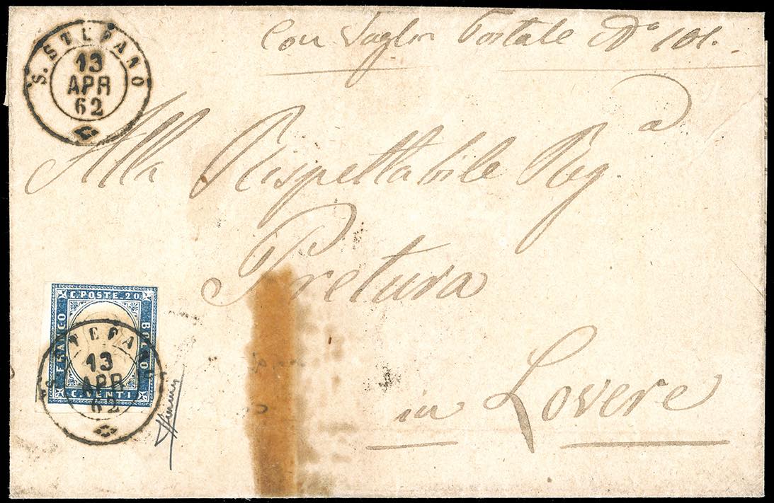 SANTO STEFANO (Codogno), sardo italiano punti 12 - 20 cent. IV emissione di Sardegna (15Dc), leggermente sfiorato in basso a destra, su lettera del 13/4/1862 a Lovere, manoscritto "con vaglia postale". Raro annullo. Cert. Sorani.
