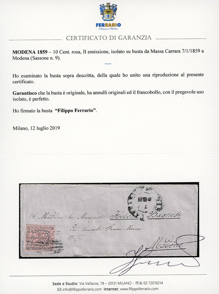 1859 - 10 cent. rosa, punto dopo le cifre (9), perfetto, isolato su busta da Massa Carrara 7/1/1859 a Modena. Pregevole uso isolato. Cert. ... Leggi tutto