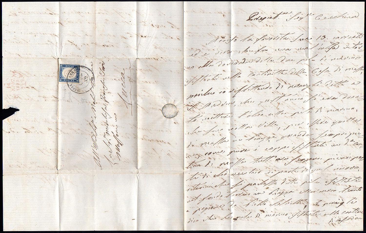 1860 - 20 cent. IV emissione di Sardegna (15Ba/C3), perfetto, su lettera da Massa Carrara 15/7/1859 a Lucca. Rara lettera dall'Oltreappennino Modenese in periodo di Governo Provvisorio. Molto fresca. Bargagli, cert. Colla.