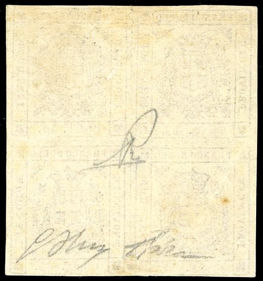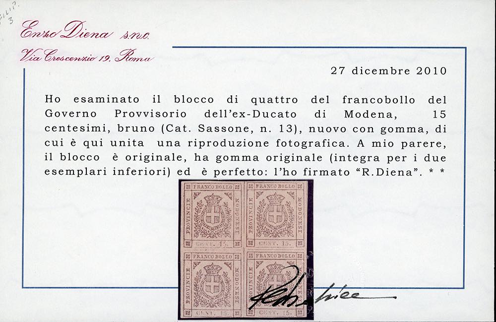 1859 - 15 cent. bruno (13), blocco di quattro, nuovo, gomma originale, integra, per i due esemplari inferiori, perfetto. Bello e raro. G.Oliva, cert. Diena.