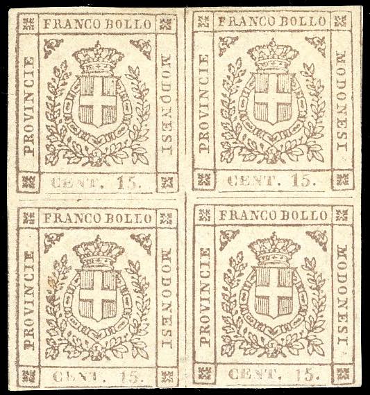 Lotto 148 - 1859 - 15 cent. bruno (13), blocco di quattro, nuovo, gomma ...