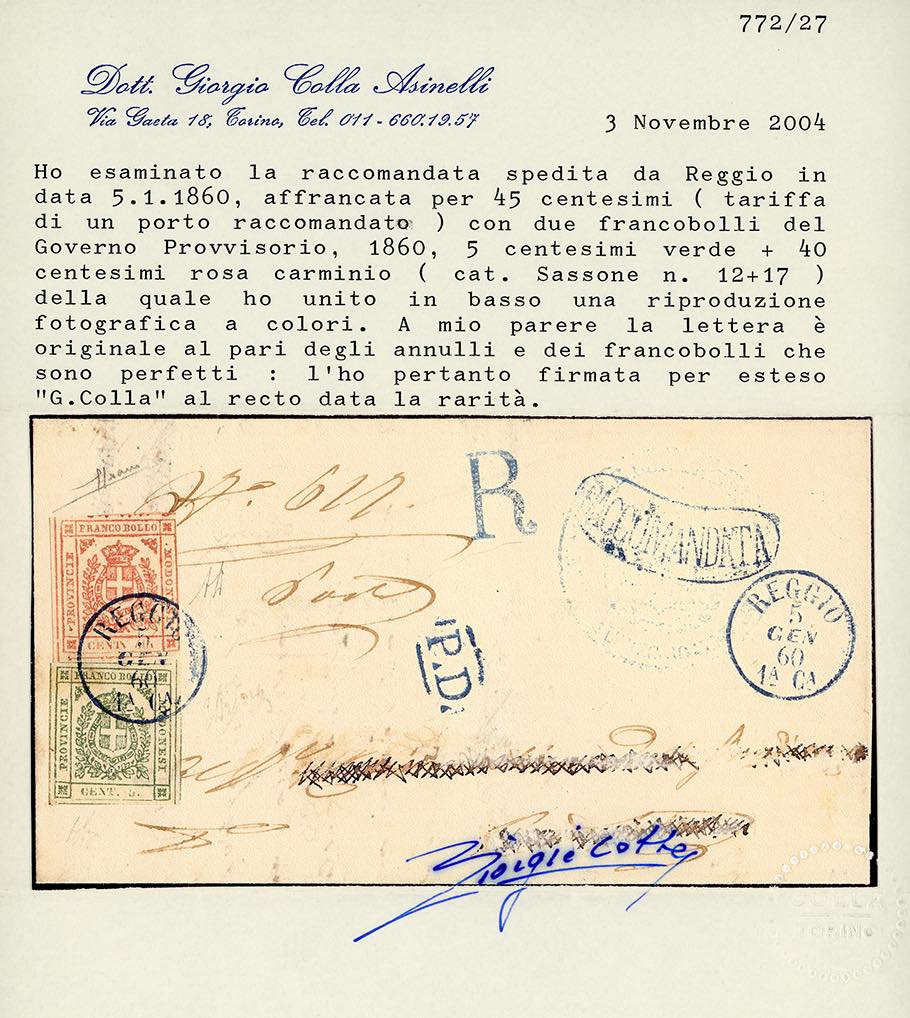 1860 - 40 cent. rosa carminio, 5 cent. verde (17,12), perfetti, su fresca lettera raccomandata da Reggio 5/1/1860. Raro. Em. ed A.Diena, Sorani, Ferrario, cert. Colla.