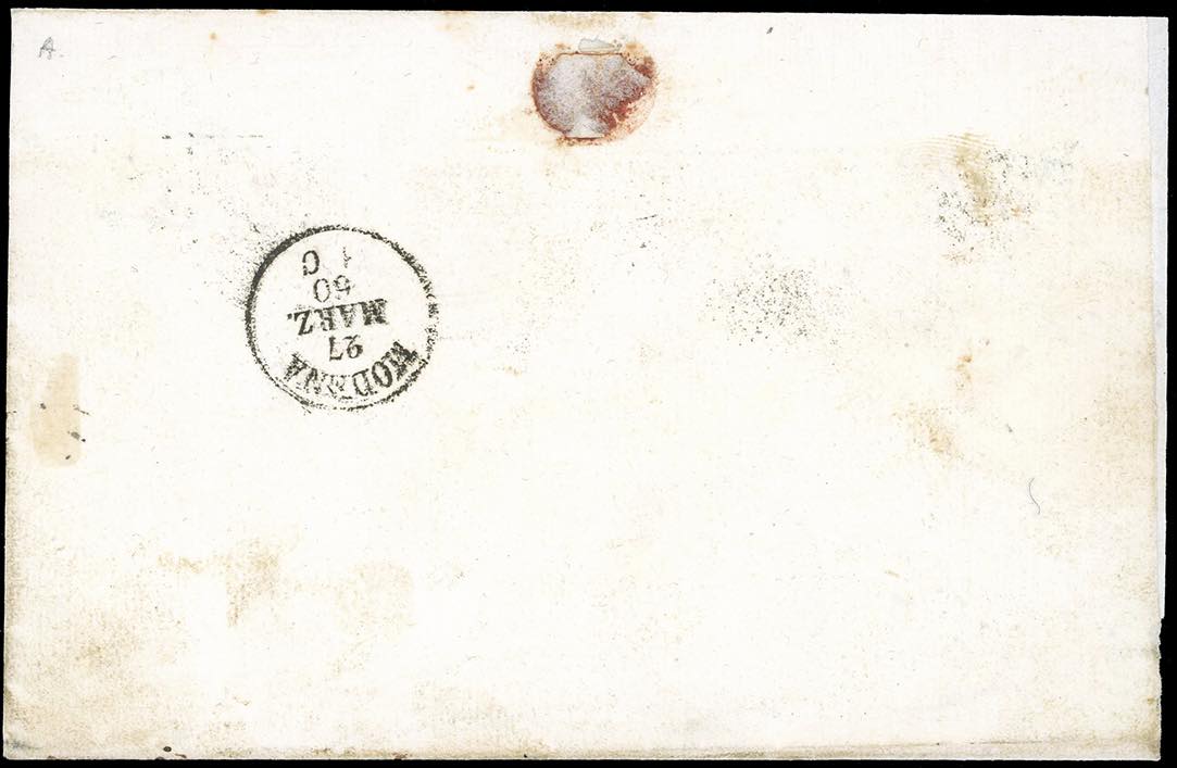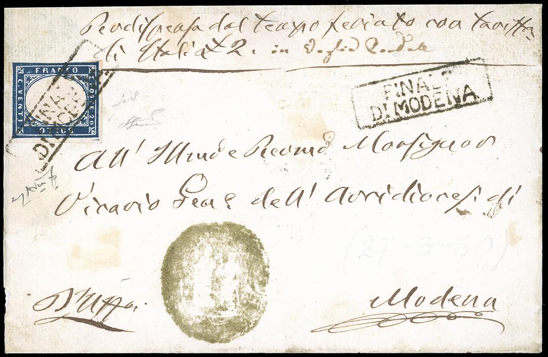 FINALE DI MODENA, cartella in nero punti R1 - 20 cent. IV emissione di Sardegna (15C), leggermente sfiorato a sinistra, su lettera per Modena, bollo di arrivo al verso del 27/3/1860, sul fronte l'indicazione che la lettera conteneva un vaglia postale di 2 lire. Si tratta dell'UNICO CASO NOTO di questo bollo in cartella quale unico annullatore dei francobolli dell IV emissione di Sardegna. Rarità del settore. Fiecchi, Ferrario, cert. Avanzo.