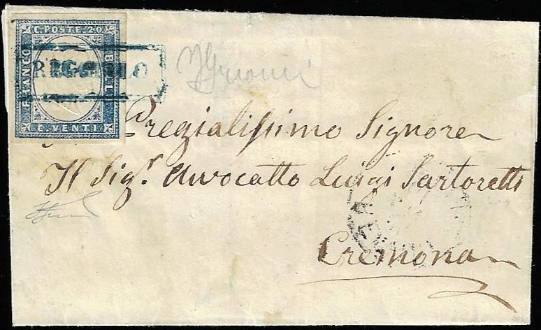 REGGIOLO, cartella azzurra punti 9 - 20 cent. (15Db), perfetto, su sovracoperta di lettera per Cremona, 25/6/1861. Grioni, Ferrario.