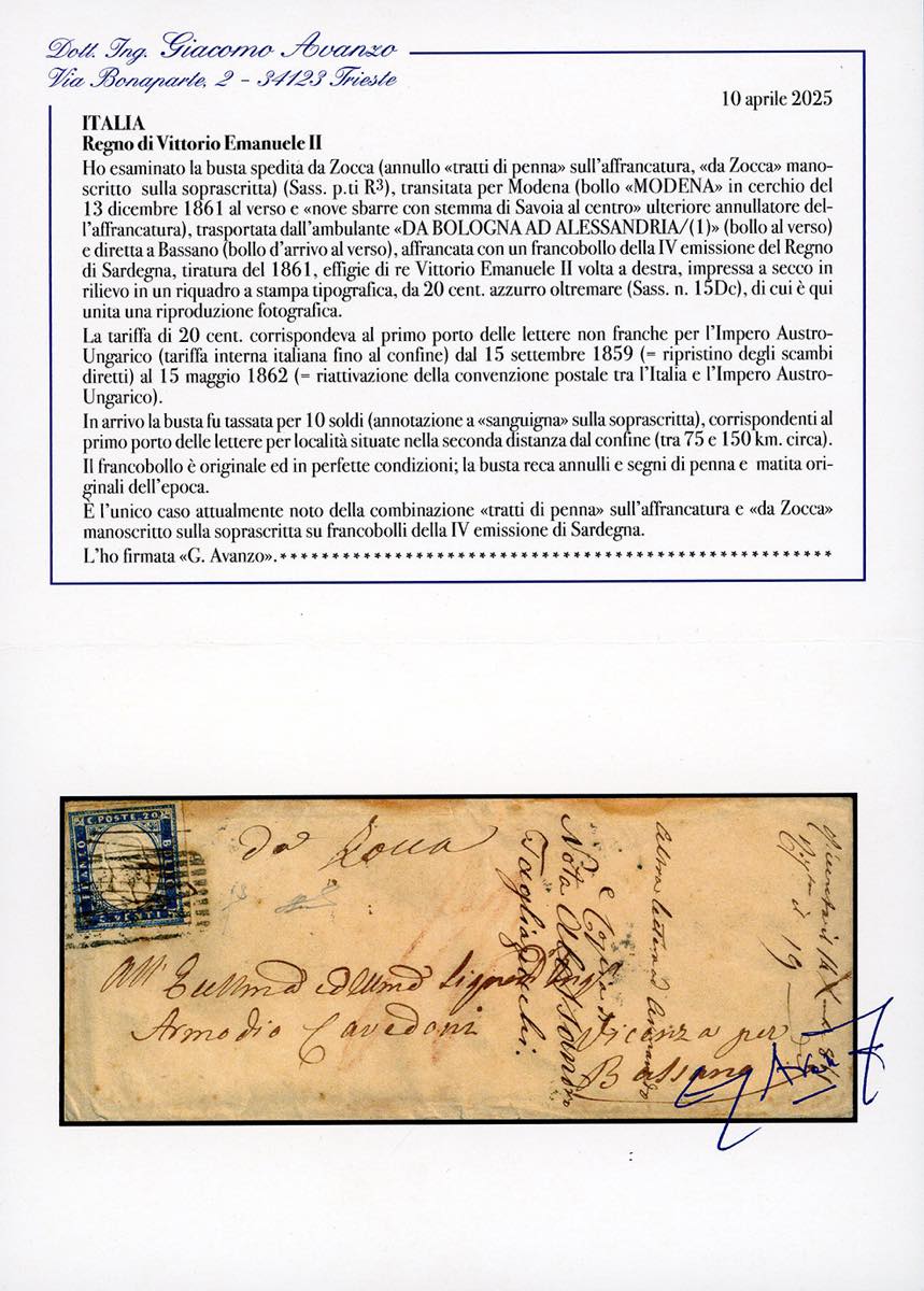 ZOCCA, manoscritto punti R3 - 20 cent. IV emissione di Sardegna (15Dc), perfetto, su busta per Bassano 15/12/1862, tassata 10 soldi in sanguigna. Il francobollo venne annullato in partenza con tratti di penna e riannullato in transito a Modena con il muto a 9 sbarre. Si tratta dell'UNICO CASO NOTO della combinazione "tratti di penna" sull'affrancatura e "da Zocca" manoscritto sul fronte. Rarità degli annullamenti di Modena, per specialista. Fiecchi, Ferrario, cert. Avanzo.