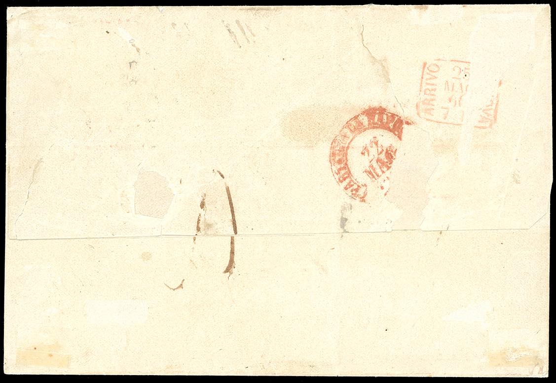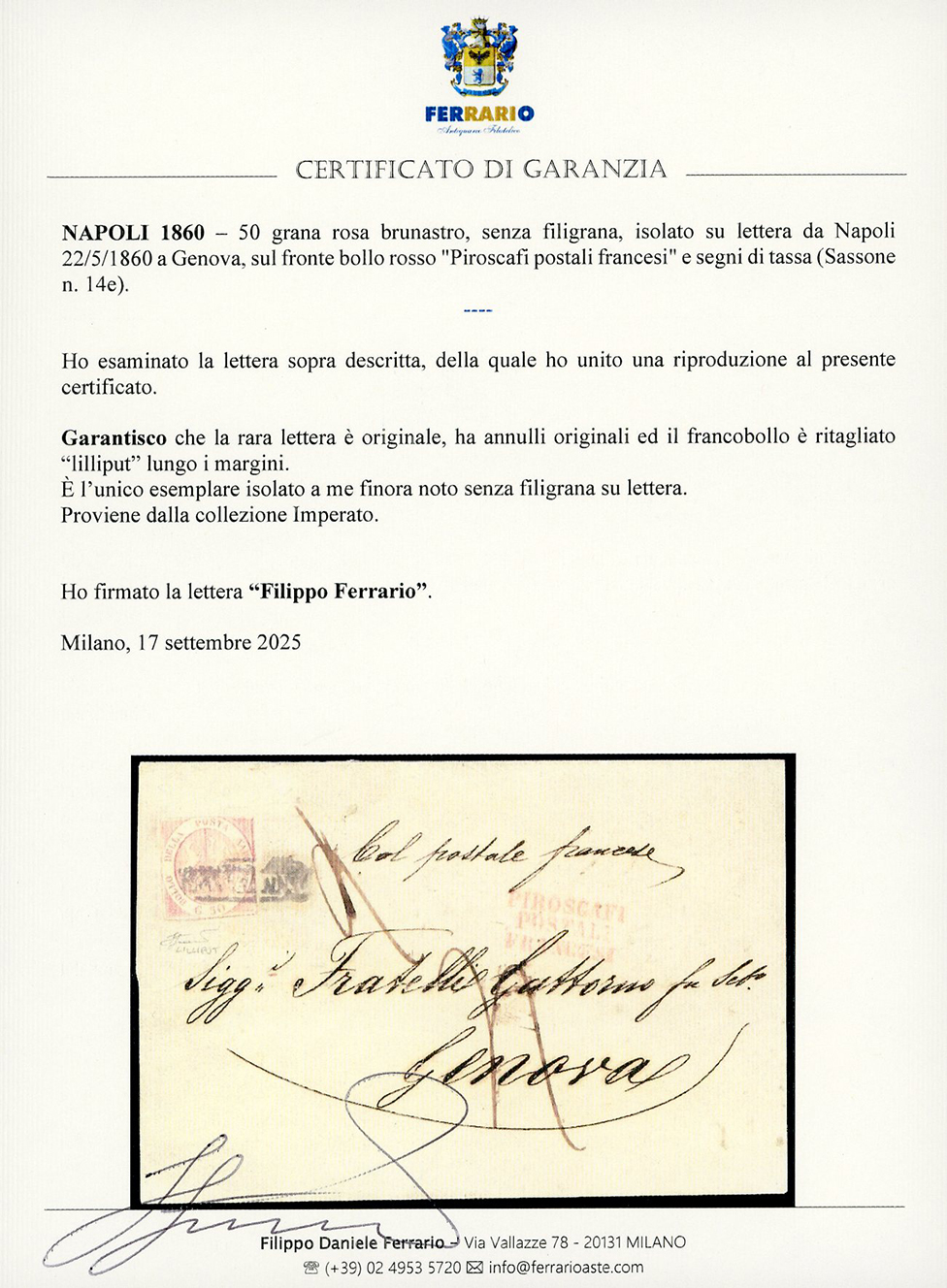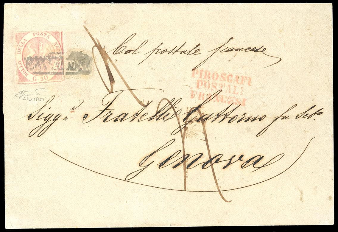 1860 - 50 grana rosa brunastro, senza filigrana (14e), ritagliato lilliput lungo i margini, isolato su lettera da Napoli 22/5/1860 a Genova, sul fronte bollo rosso "Piroscafi postali francesi" e segno di tassa. INSIEME UNICO! Cert. Ferrario. Ex coll. Imperato.