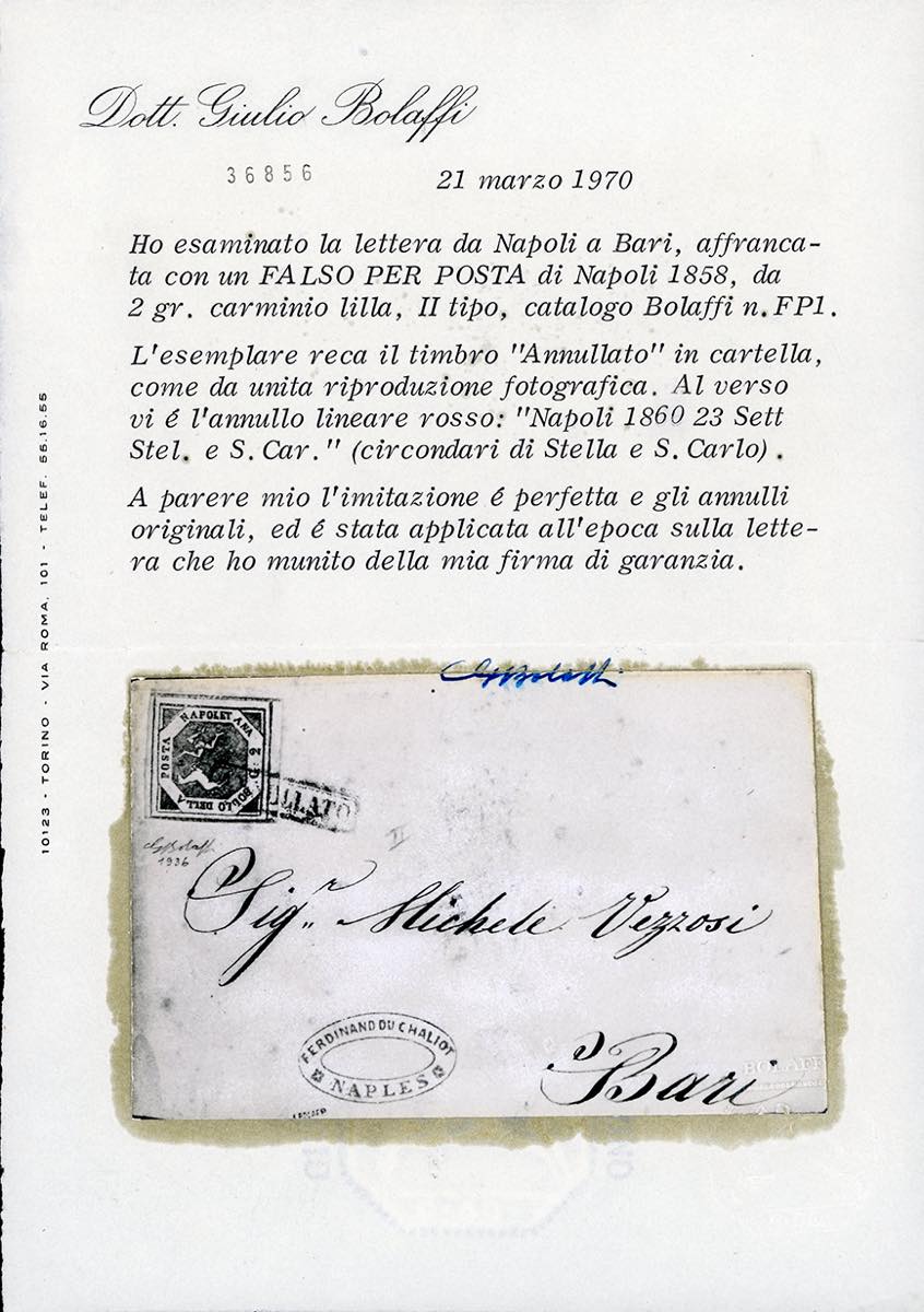 1860 - 2 grana violetto, falso per posta del II tipo (F2b), perfetto, su sovracoperta di lettera da Napoli 23/9/1860 a Bari. A.Diena, cert. G.Bolaffi.
