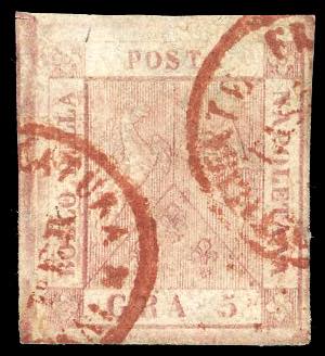 NAPOLI-TASSA PER INSUFFICIENTE AFFRANCATURA, punti R1 - 5 grana (9), perfetto, con il bollo accessorio in rosso come unico annullatore. Molto raro. Em. e A.Diena, Raybaudi, cert. Colla.