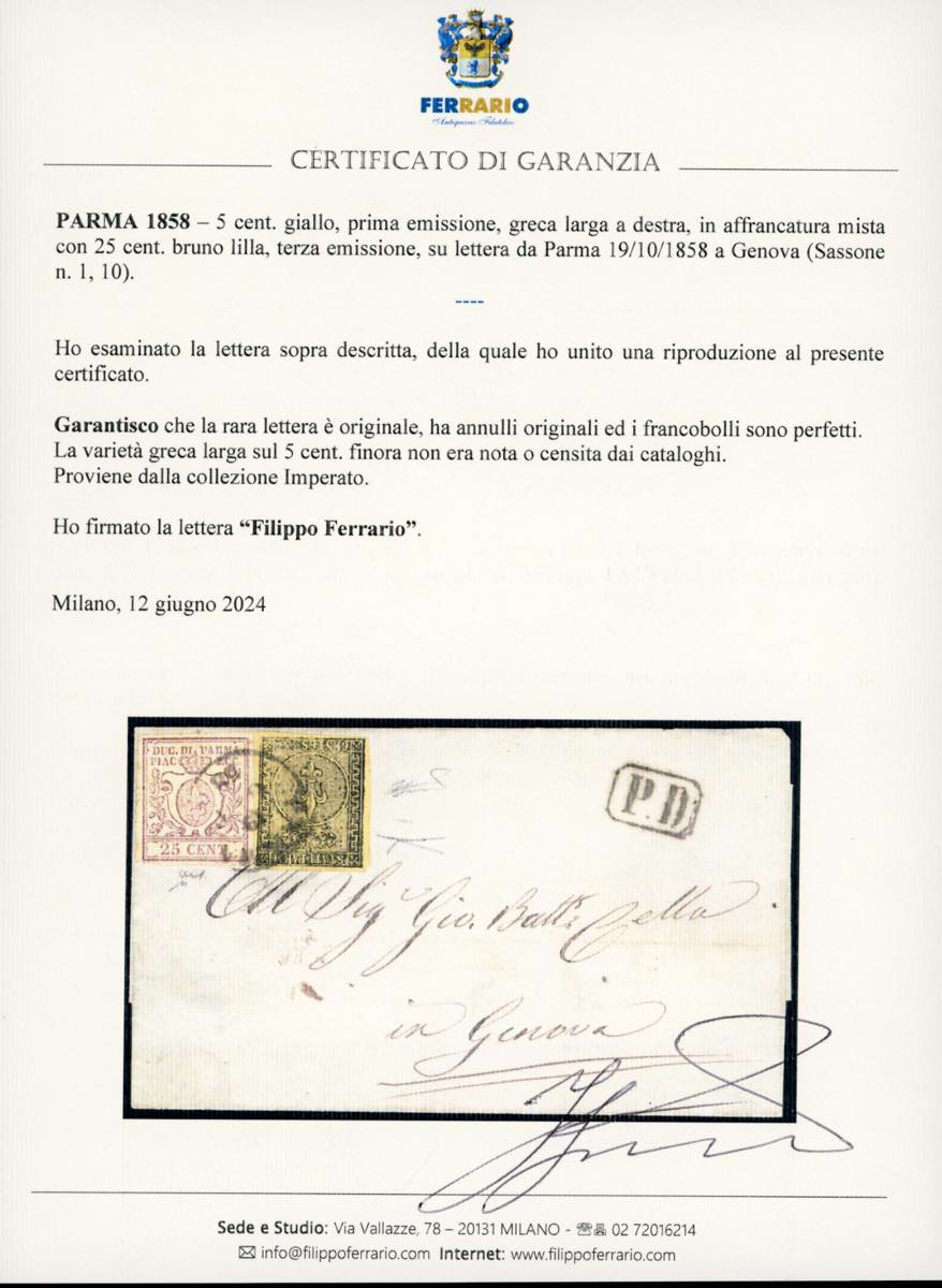 1858 - 5 cent. giallo, prima emissione, GRECA LARGA A DESTRA, in affrancatura mista con 25 cent. bruno lilla, terza emissione (1,10), perfetti, su lettera da Parma 19/10/1858 a Genova. La varietà greca larga sul 5 cent. finora non era nota o censita dai cataloghi. Rarità e insieme UNICO. Chiavarello, cert. Bottacchi e Ferrario. Ex coll. Imperato.