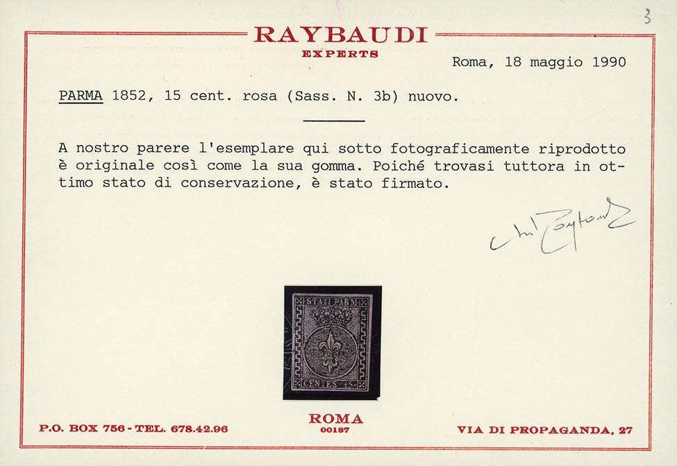 1852 - 15 cent. rosa, greca larga a sinistra (3b), nuovo, gomma originale, perfetto, grandi margini. Raro e di ottima qualità. Cert. G.Oliva e Raybaudi.