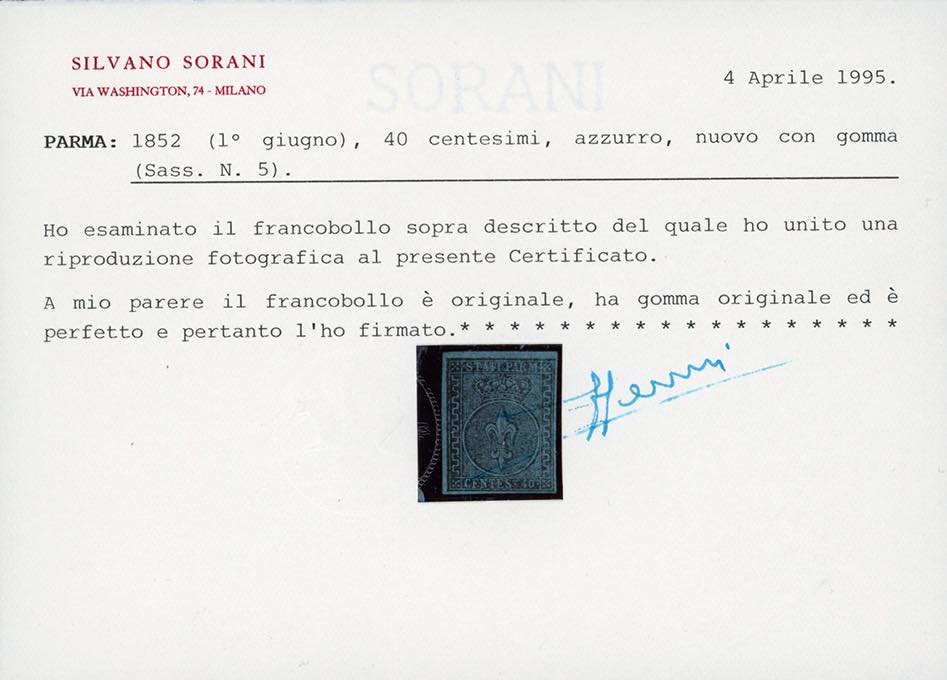 1852 - 40 cent. azzurro (5), gomma originale, leggera traccia di linguella, perfetto e molto fresco. Raro. Cert. Sorani.