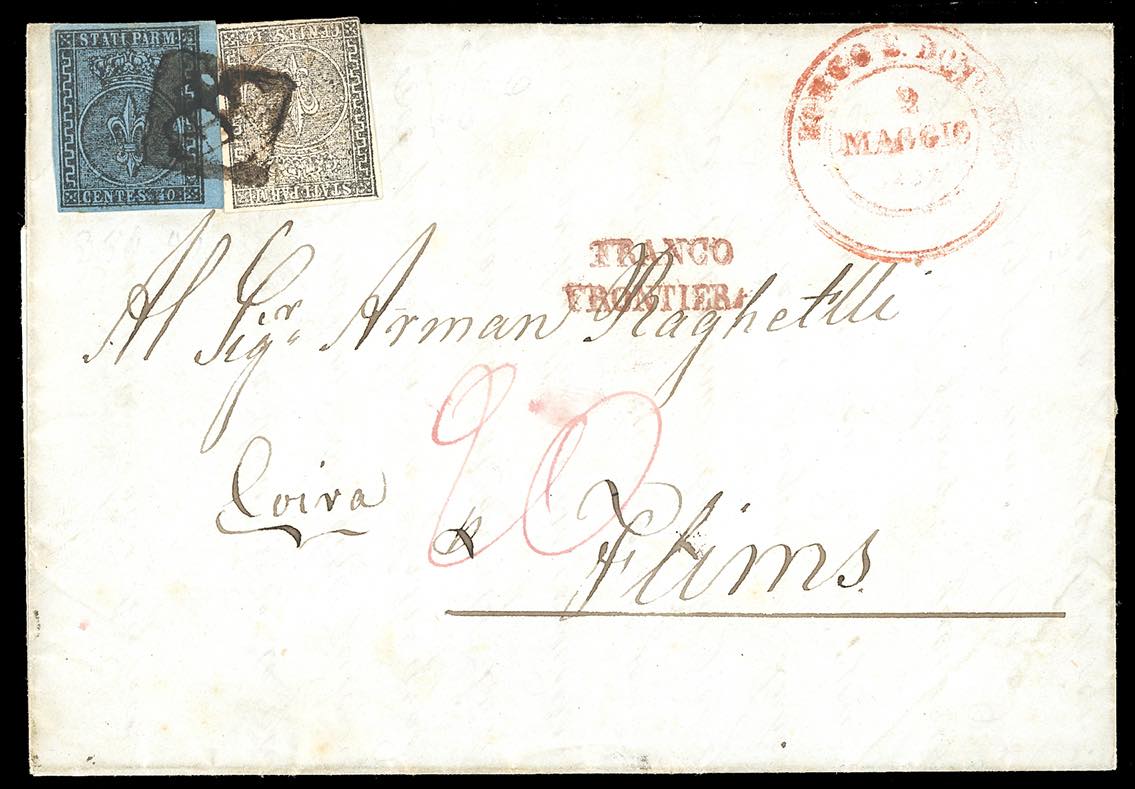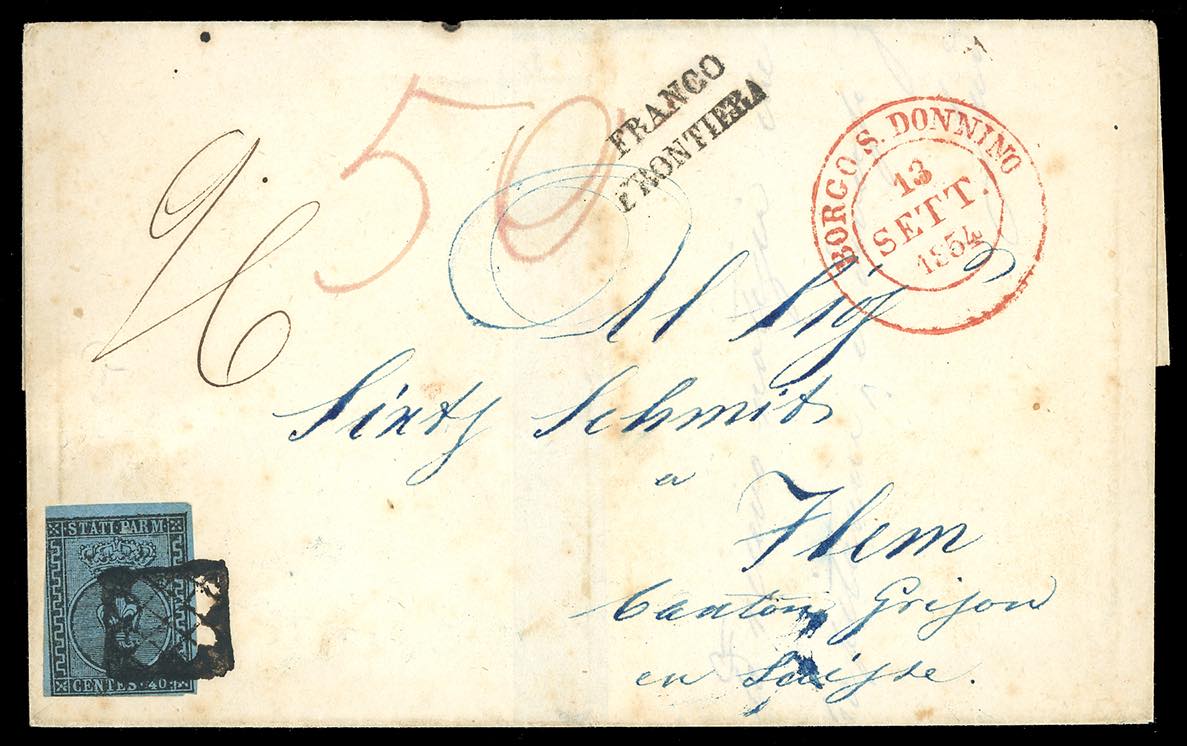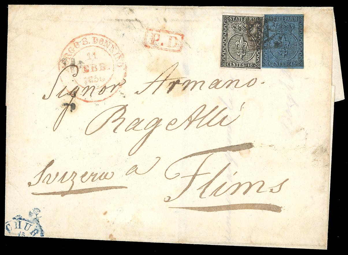 1854/56 - Rarissimo insieme di tre lettere d'archivio per Flims in Svizzera, diversamente affrancate e tassate: 40 cent. azzurro (5a), su lettera da Borgo S.Donnino 13/9/1854, lineare "lineare franco frontiera" in nero e doppia tassazione "9/6" e "50"; 10 cent. bianco e 40 cent. azzurro (2,5a), su lettera da Borgo S.Donnino 2/5/1855, lineare "franco frontiera" in rosso e tassa "20"; 10 cent. bianco e 40 cent. azzurro (2,5), su lettera da Borgo S.Donnino 11/2/1856, bollo riquadrato "P.D" in rosso, Insieme estremamente raro, frutto di un recente ritrovamento d'archivio. Pochissime lettere note dal Ducato di Parma alla Svizzera.
