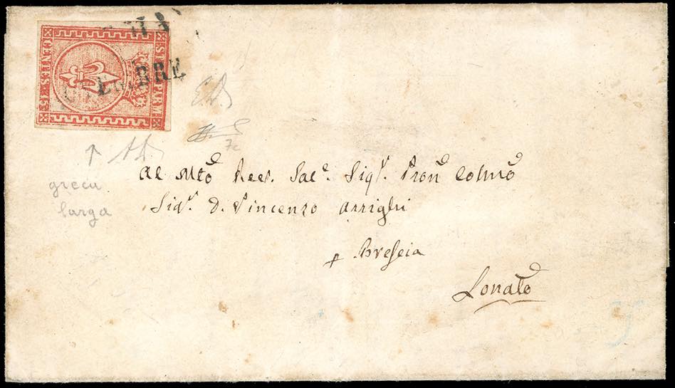 1854 - 15 cent. vermiglio, greca larga a destra e stampa secca (7c), ottimo stato, su lettera da Parma 8/11/1854 a Lonato. Em. e A.Diena, Ferrario.
