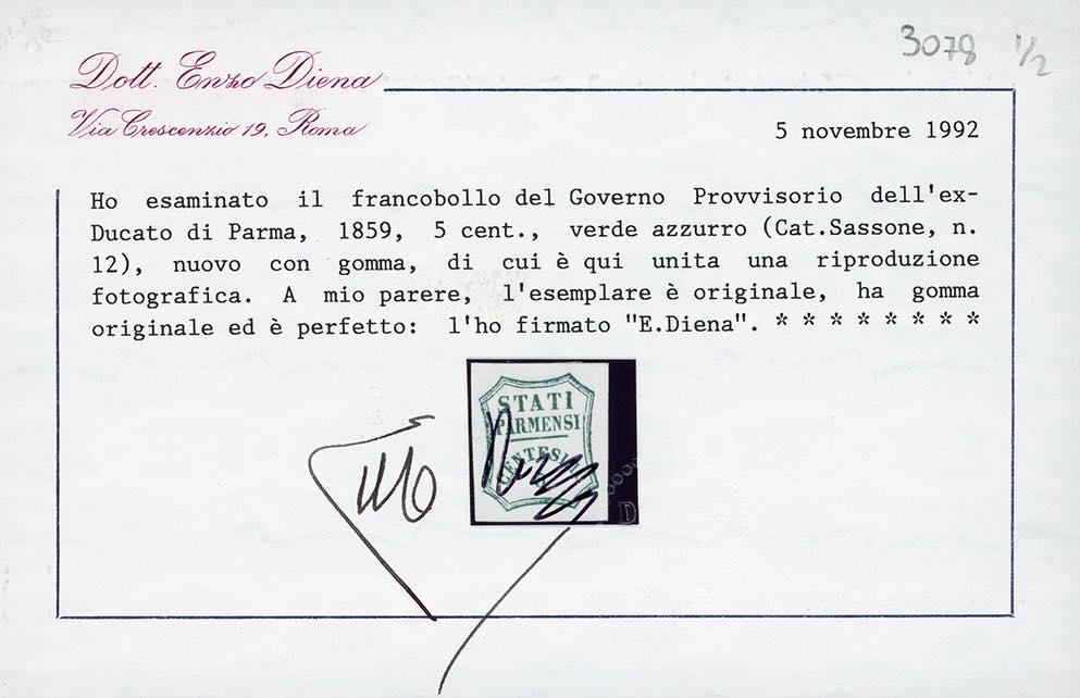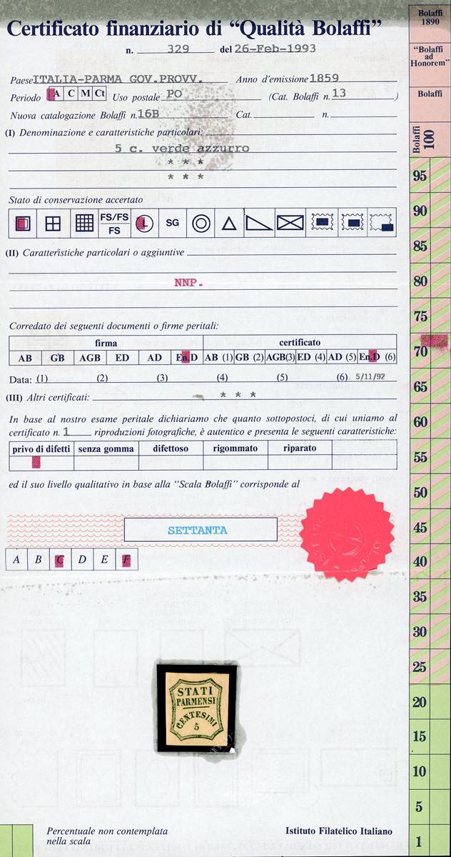 Lotto 321 - 1859 - 5 cent. verde azzurro, I composizione (12), nuovo, ...