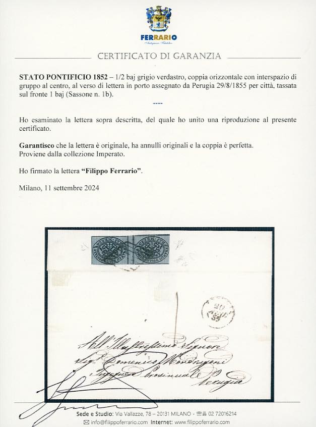 1855 - 1/2 baj grigio verdastro (1b), coppia orizzontale con interspazio di gruppo al centro, perfetta, al verso di fresca lettera in porto assegnato da Perugia 29/8/1855 per città, tassata sul fronte 1 baj. Bella e rara. A. ed E.Diena, cert. Ferrario. Ex coll. Imperato.