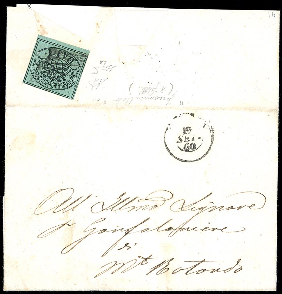 1860 - 1 baj verde scuro, I composizione, preannullato a griglia, otto filetti (2Ac), perfetto, al verso di lettera in porto assegnato da Roma 19/9/1860 a Monte Rotondo. Molto rara e di ottima qualità. A.Diena, cert. Ferrario.