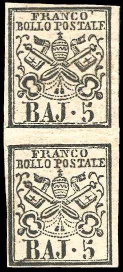 1852 - 5 baj rosa chiaro (6), coppia verticale con interspazio di gruppo al centro, gomma originale, integra per l'esemplare inferiore, ... Leggi tutto