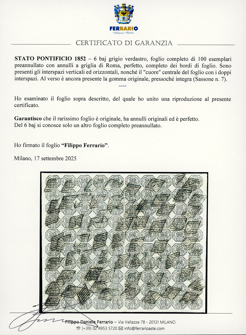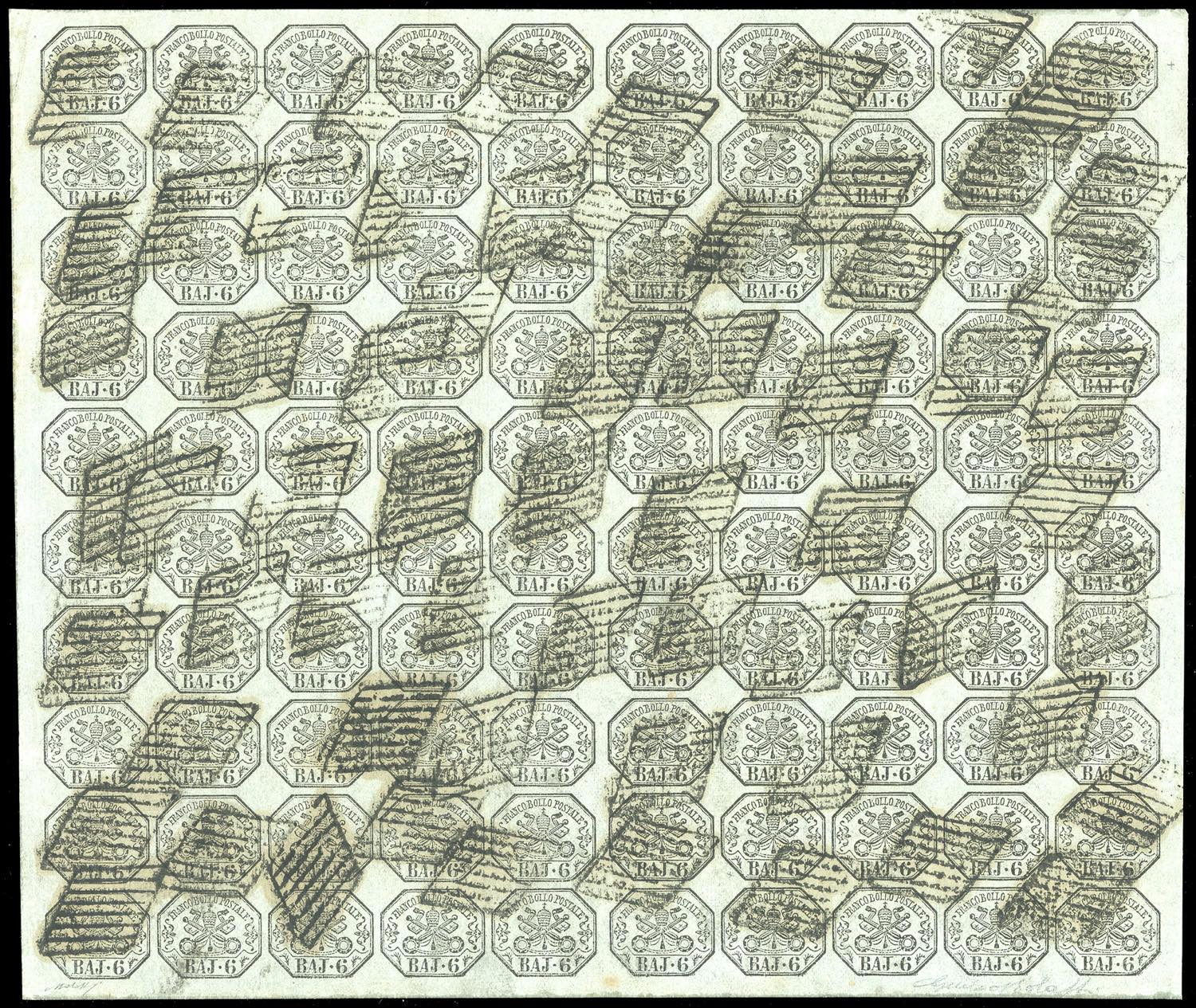 1852 - 6 baj grigio verdastro (7), foglio completo di 100 esemplari preannullato con annulli a griglia di Roma, perfetto, completo dei bordi di foglio. Sono presenti gli interspazi verticali ed orizzontali, nonché il "cuore" centrale del foglio con i doppi interspazi. Al verso è ancora presente la gomma originale, pressochè integra. Del 6 baj si conosce solo un altro foglio completo preannullato. Insieme straordinario, di rarità assoluta. Firmato Giulio Bolaffi per esteso, Alberto Bolaffi, Emilio ed Alberto Diena, cert. Ferrario.