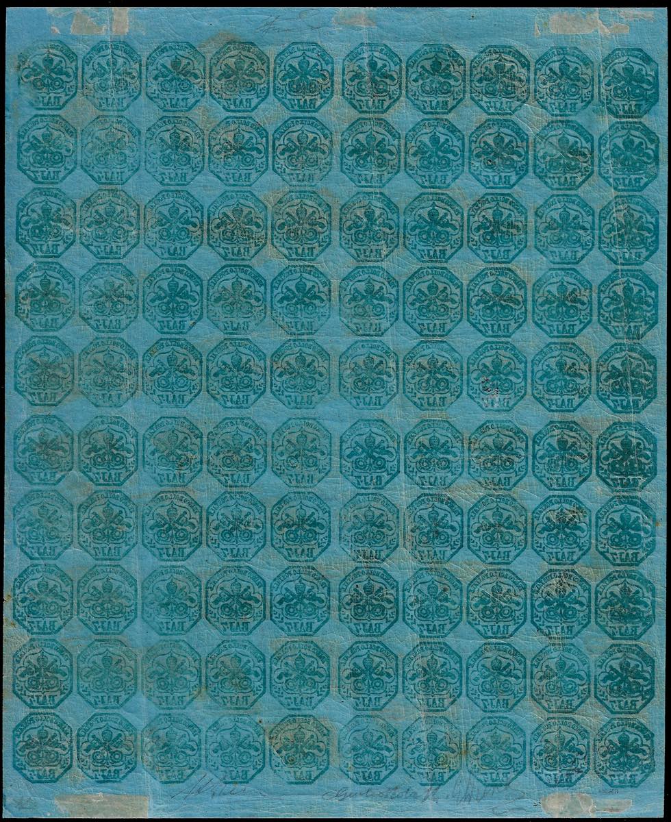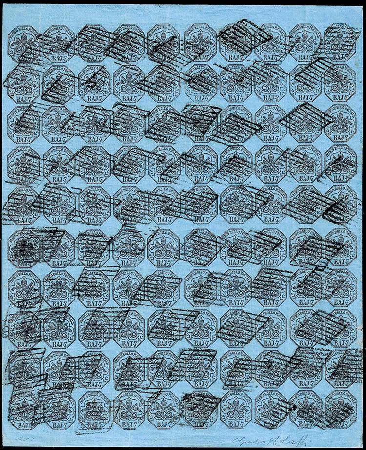 1854 - 7 baj azzurro, INCHIOSTRO GRIGIO OLEOSO (8b), foglio completo di 100 esemplari, usato con annulli a griglia di Roma in quanto preannullato, perfetto, completo dei bordi di foglio. Sono presenti gli interspazi verticali, orizzontali e il "cuore" centrale, essendo il foglio composto da quattro gruppi di 25 esemplari. Si presenta ancora con la gomma originale al verso, pressochè intatta. Del 7 baj si conosce solo un altro foglio, di qualità inferiore, al momento non rintracciabile. Questo è l'unico dei due stampato con inchiostro oleoso. Non si conoscono fogli nuovi del 7 baj. Insieme straordinario, di eccezionale impatto visivo. Grande rarità dello Stato Pontificio. Firmato Giulio e Alberto Bolaffi, Emilio ed Alberto Diena, cert. Ferrario.