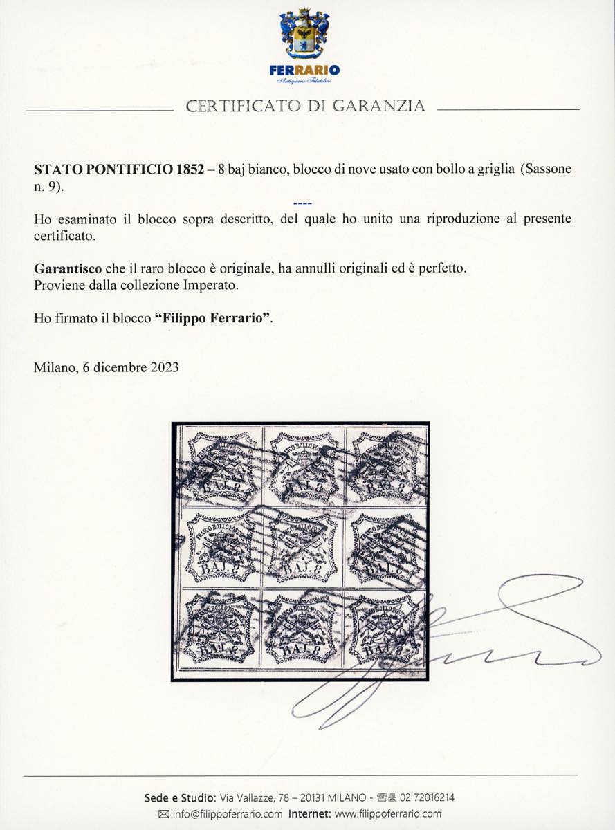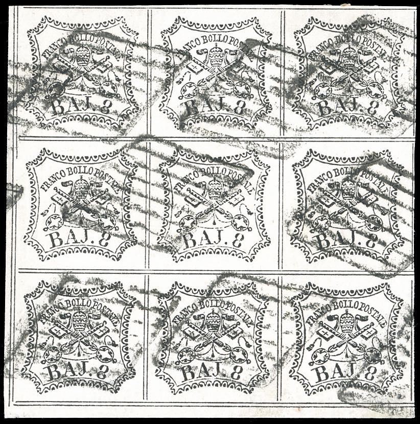 1852 - 8 baj bianco (9), blocco di nove usato con bollo a griglia, perfetto. Splendido e raro. Alberto e Enzo Diena, per esteso, Giulio Bolaffi, cert. Ferrario. Ex coll. Imperato.