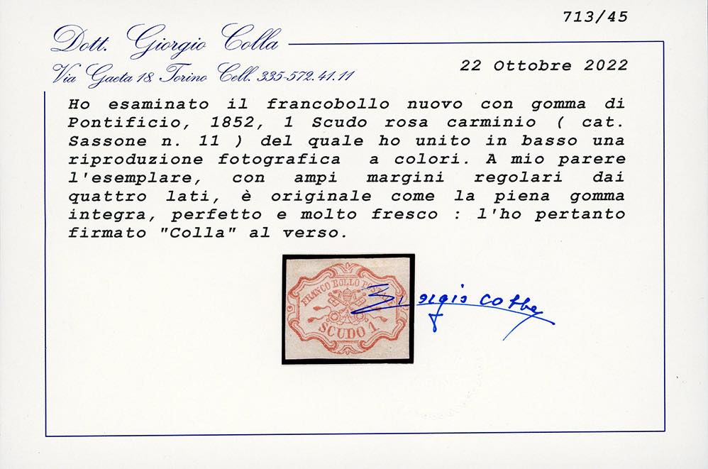 Lotto 413 - 1852 - 1 scudo rosa carminio (11), nuovo, gomma originale ...