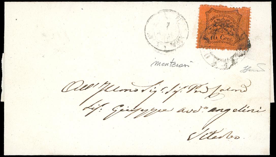 MONTEROSI, 2C s.d. punti 11 - 10 cent. (26), perfetto, su fresca sovracoperta di lettera per Viterbo 8/8/1869. Non comune e sottoquotato. ... Leggi tutto