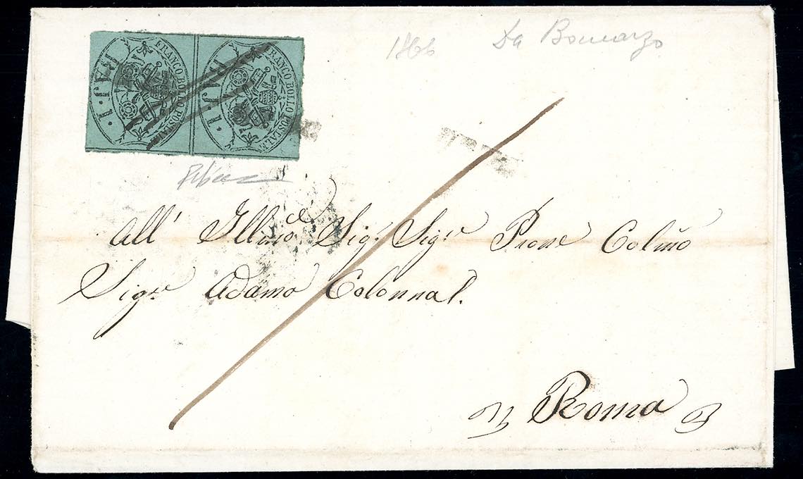ORTE, SD + penna non catalogato - 1 baj (2B), coppia verticale, su sovracoperta di lettera scritta a Bomarzo 13/2/1866 per Roma. Combinazione di annulli inedita. R.Diena.