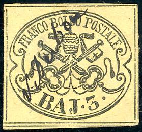 VITERBO, a penna, non catalogato - 3 baj giallo cromo (4A), assottigliato, annullato a penna con il nome della città. Unico caso noto! ... Leggi tutto