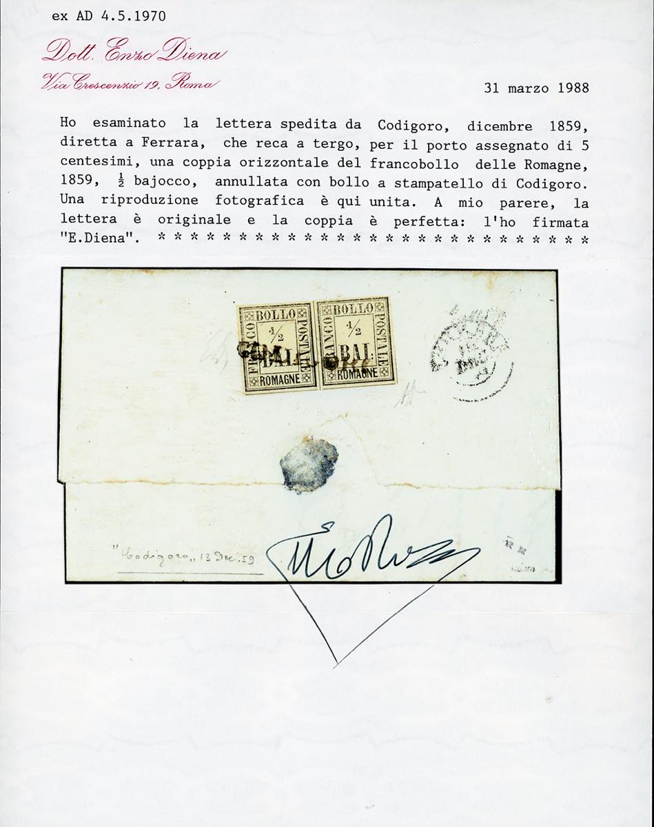1859 - 1/2 baj giallo paglia (1), coppia, perfetta, al verso di lettera in porto assegnato da Codigoro 13/12/1859 a Ferrara, tassata 5 cent. Bella! Emilio Diena, cert. A. ed E.Diena.