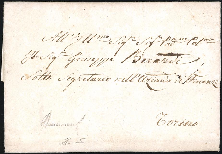 1820 ca - 15 cent. Cavallino, impressione a secco (4), lievissima piega orizzontale, per Torino. Bello. Ferrario. Ex coll. Imperato.