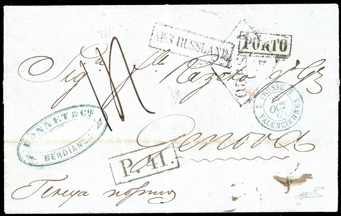 INCOMING MAIL IMPERO RUSSO UCRAINA 1860 - Lettera non affrancata da Berdiansk 15/10/1860, a Genova, tassata 1,40 lire, sul fronte bollo in cartella "P41" prussiano per addebitare alla Francia 80 cent. Ferrario. Ex coll. Imperato.