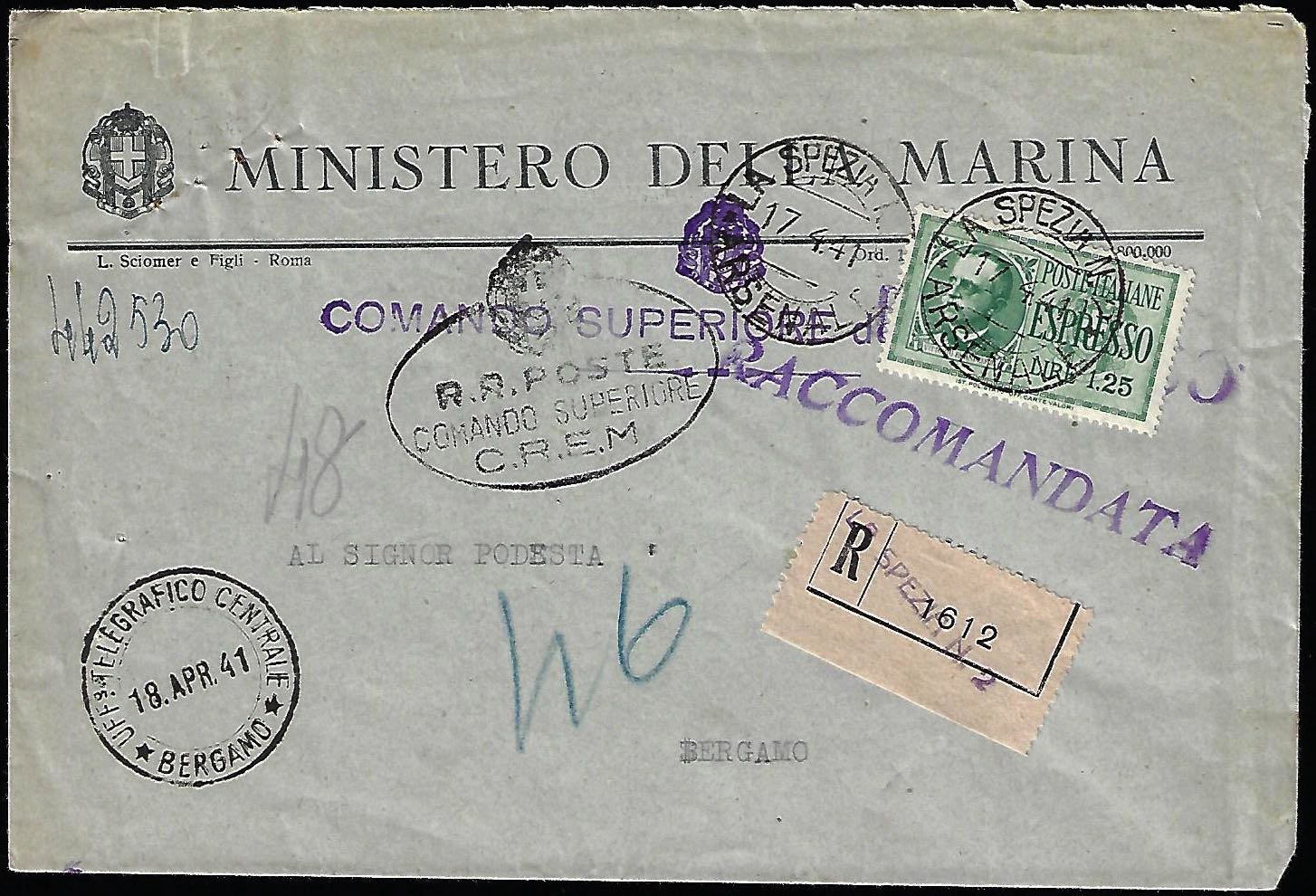 1941 - 1,25 lire espresso (15), perfetto, isolato su busta raccomandata in franchigia da La Spezia 17/4/1941 a Bergamo. Pregevole uso isolato.