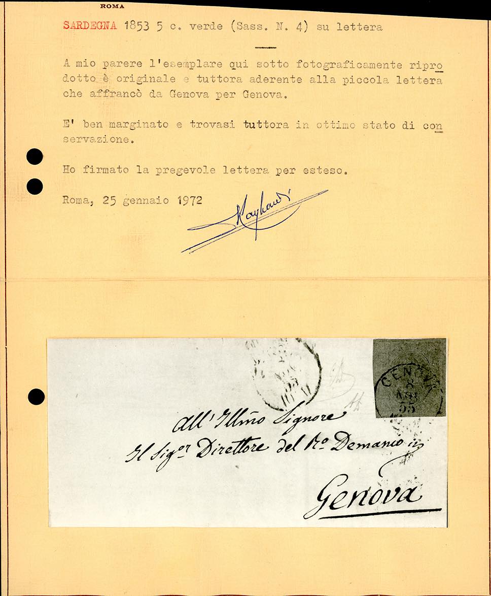 1855 - 5 cent. verde (4), perfetto, isolato su fresca lettera da Genova 8/11/1855 per città. Pregevole uso isolato, di ottima qualità. ... Leggi tutto