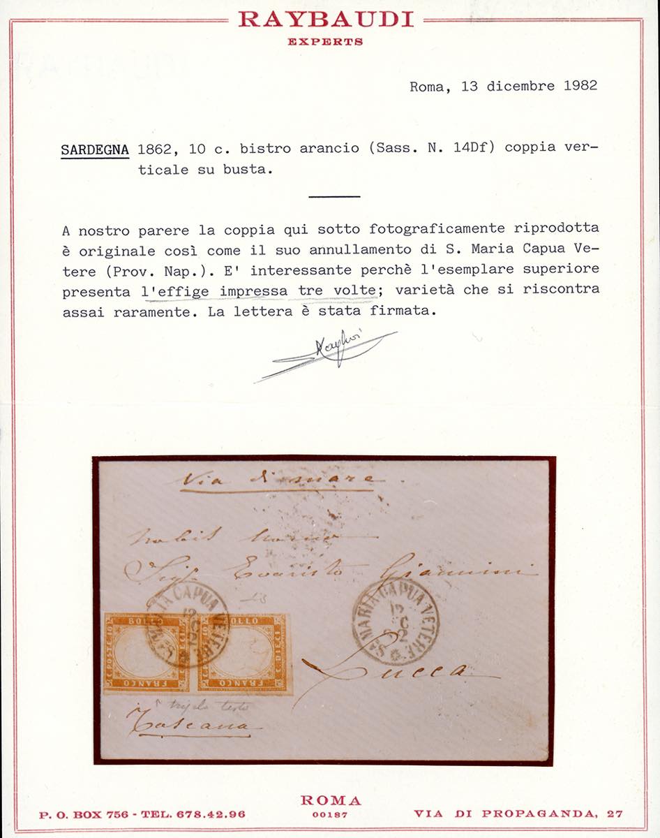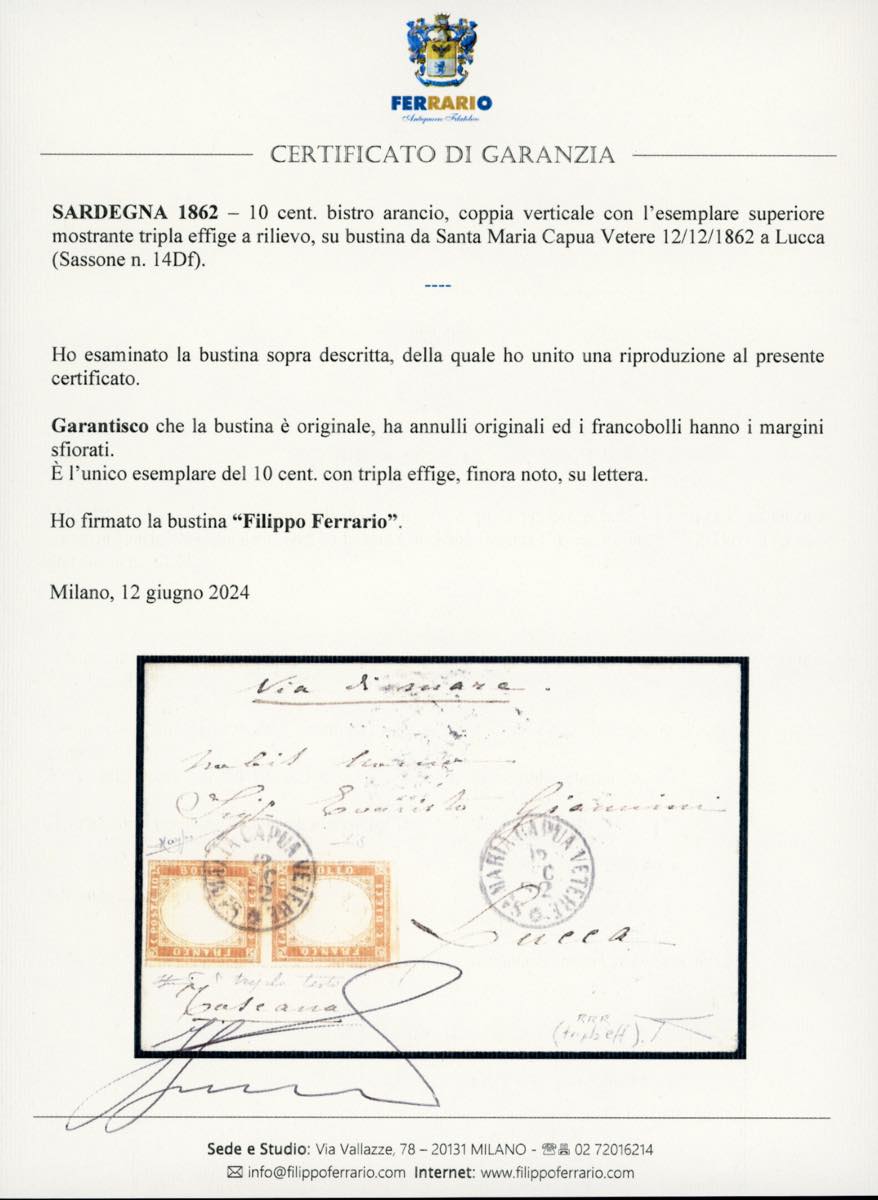 1862 - 10 cent. bistro arancio, coppia verticale con l'esemplare superiore mostrante TRIPLA EFFIGIE A RILIEVO (14df), margini sfiorati, su bustina da Santa Maria Capua Vetere 12/12/1862 a Lucca. Insieme molto raro e in ottimo stato di conservazione. Il Sassone non cataloga esemplari con tale evidente varietà su corrispondenza. Rarità della IV emissione di Sardegna. Fiecchi, cert. Bottacchi, Ferrario, Raybaudi.